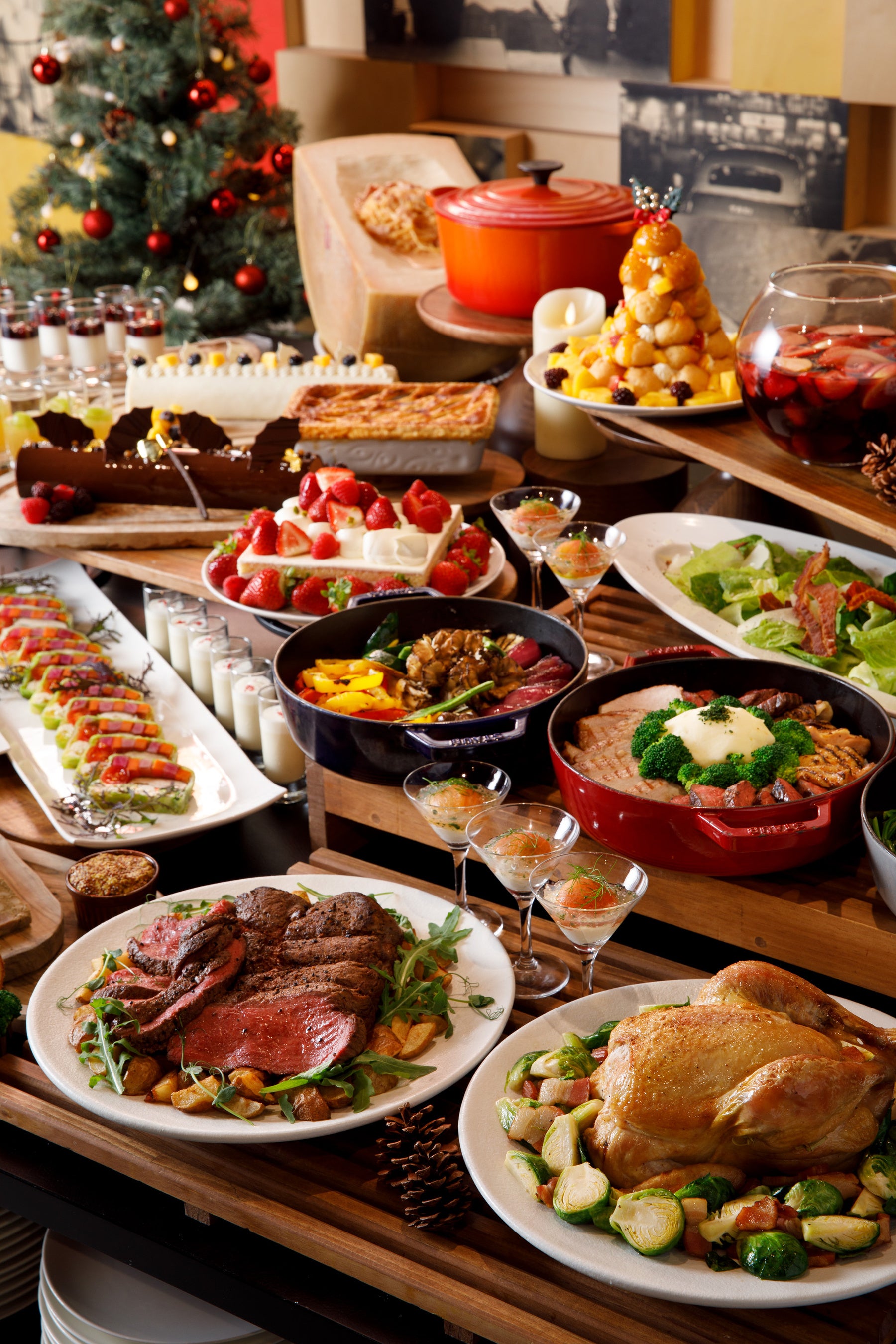 デザート:苺のショートケーキ / ブッシュドノエル ショコラ ベリー / ブッシュドノエル マンゴー フロマージュ / ブッシュドノエル 抹茶 バニラ / アップルパイ / シュークリームツリー / フルーツサングリア / ラ・フランスのジュレ / ビターチョコレートケーキ キャラメルシャンティ / ブレッドプディング / シュトーレン / パンナコッタ ミックスベリーコンポート / フルーツサラダ
