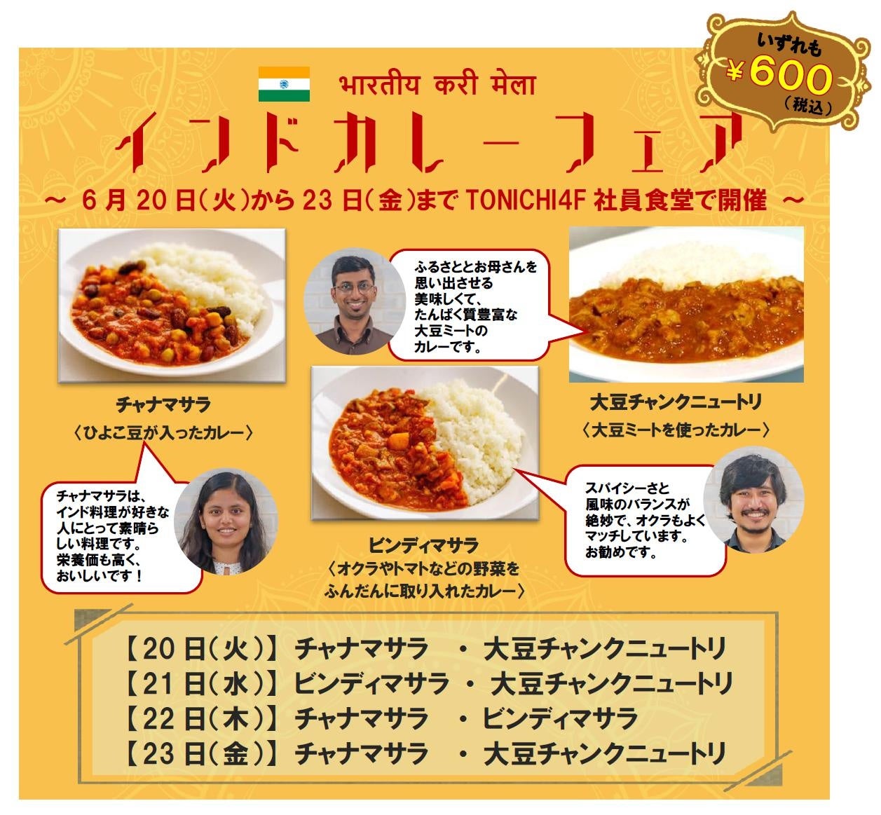 TONICHIは、理系大学世界最高峰の一つと称されるインド工科大学卒業のエンジニアが6名在籍しています。中にはベジタリアンの社員もいるため、食堂では日頃から肉・魚・卵を使用しないカレーも特別に提供しています。今回のカレーフェアは、彼らがおススメする本場のカレーを、当食堂のチーフで懐石料理店を32年間務めた和食の達人が、日本人にも合う味付けで再現した異色のコラボフェアです。なお、ベジタリアンや宗教食にも配慮し、肉・魚・卵などを一切使わずスパイスで調理し、健康志向やダイエット中の方にもぴったりのカレーフェアとなっています。