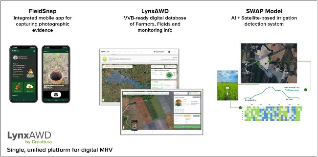 本プロジェクトの推進を可能にしているのが、クレアトゥラが自社開発し特許を取得したデジタルMRVシステム「LynxAWD」です。同システムは、AWDの実施状況を管理するために必要な膨大なデータを統合的に扱うことができるプラットフォームであり、協力農家の基本情報や圃場面積、湛水・排水の管理状況など、プロジェクト運営に不可欠な情報を一元的に管理します。また、現地で撮影された湛水・排水の写真データを、モバイルアプリ「FieldSnap」と連携させることで即時に紐付け、シーズンあたり10万枚を超える画像を自動的に整理する仕組みを実装しています。さらに、衛星データとAIを組み合わせたSWAPモデル(Surface water absence and presence)を用いて、地表が植物に覆われている状況下でも湛水・排水の状態を遠隔で検知できるため、従来は人手で行うほかなかった圃場モニタリング作業を大幅に効率化し、大規模化と精度向上を同時に実現しています。