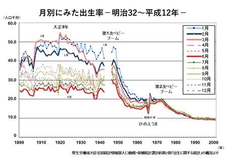 明治から昭和初期にかけては、1、2、3月生まれが多く、6、7、8月生まれが少ないことが見て取れる。この傾向は、工業化が進んできた第2次ベビーブーム頃にはなくなっている。すなわち、日本においても、季節的な出生率の変動は、認められていた。1,2,3月生まれは、日が長くなる4月から6月頃に妊娠したと考えられ、6、7、8月生まれは、日が短くなくなる9月から11月頃に妊娠したと考えられる。