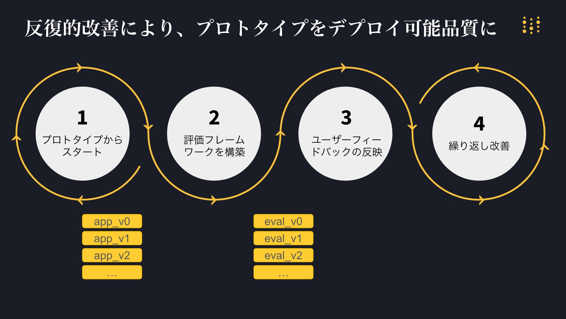 このプロセスにより、システムの「ブラックボックス化」を防ぎ、体系的かつ明確な評価基準を確立することが可能となります。これにより、プロトタイプ段階のアプリケーションを反復的に改善し、最終的なデプロイメントへのスムーズな移行を実現する道筋を描くことができます。