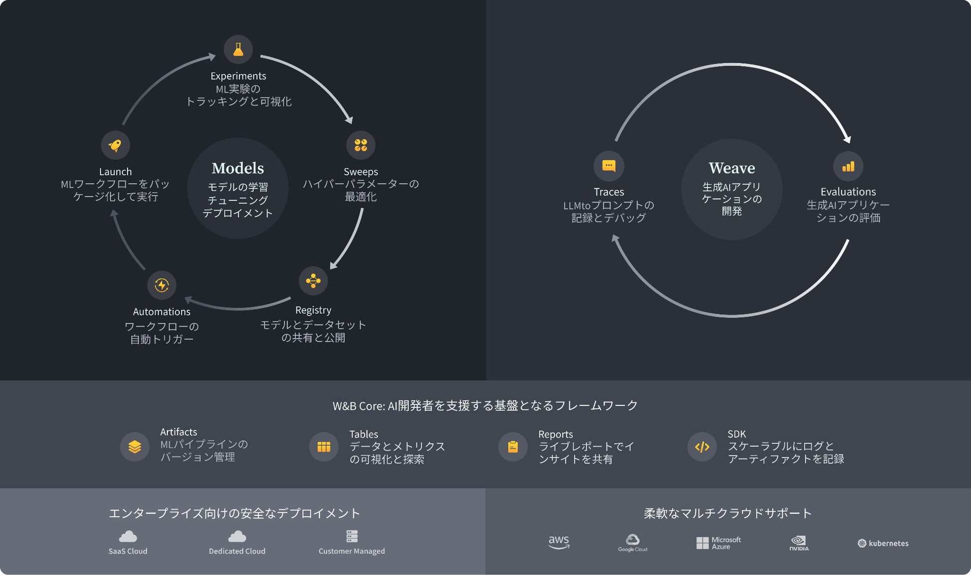 これに伴い、従来「WandB」として知られていた製品の名称を「W&B Models」に変更いたしました。「W&B Weave」とともに、AIのモデル開発およびアプリケーション開発を一元的にサポートするプラットフォームとして機能します。このプラットフォームは、AI開発に携わるエンジニアや研究者のみならず、AIを活用したアプリケーションの開発やシステム統合を手掛けるソフトウェアエンジニアの作業効率を向上させるためのワークフローを提供します。