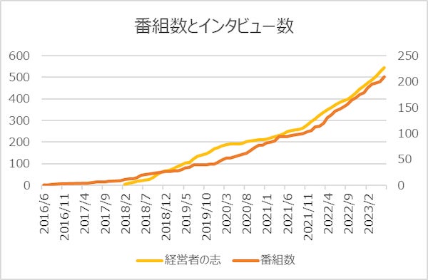 比較:プロデュース番組数の推移と『経営者の志』のインタビュー数