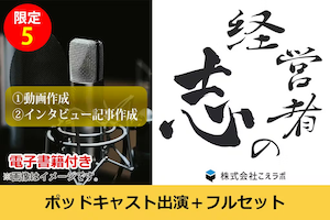 電子書籍「~売り込まなくても見込み客が集まる~経営者のためのオンライン集客の教科書(仮)」に加え、株式会社こえラボが運営するポッドキャスト番組「経営者の志」にご出演いただける権利です。また出演時のインタビュー動画、インタビューをまとめた記事などのオプションもセットでお渡しいたします。