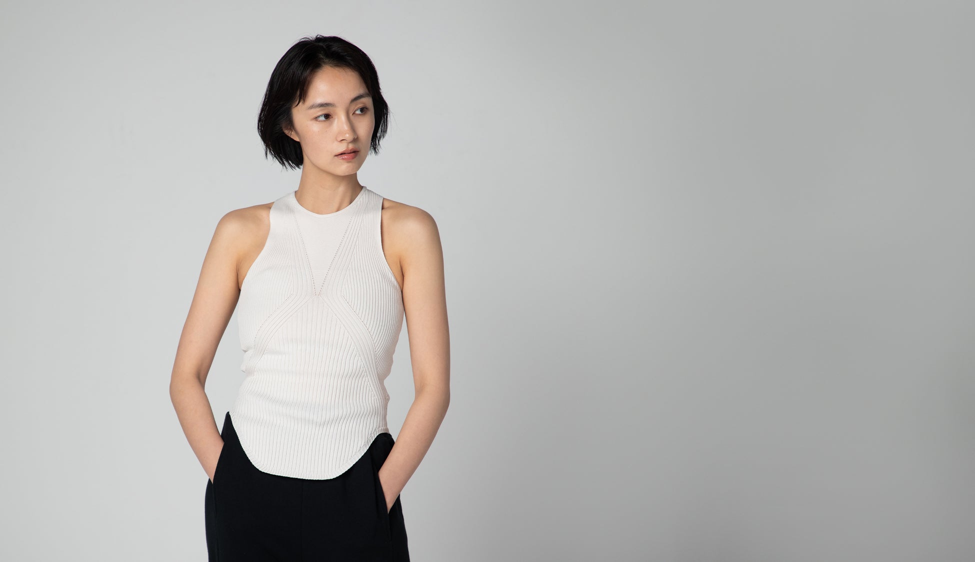ウィメンズアイテムには、シームレスなホールガーメント技術により、縫い目ができない編み方を採用しています。1本の糸で1着の服を立体的に編み上げられるため、着る人の心と体をゆったりと包み込み、無理な突っ張りがなく、体へ自然に寄り添います。