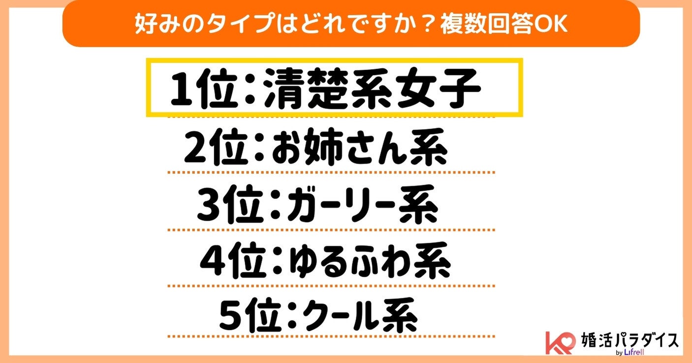 「清楚系女子」が最も多い回答を得た一方で、「お姉さん系」「ガーリー系」といったタイプも根強い人気があることがわかりました。