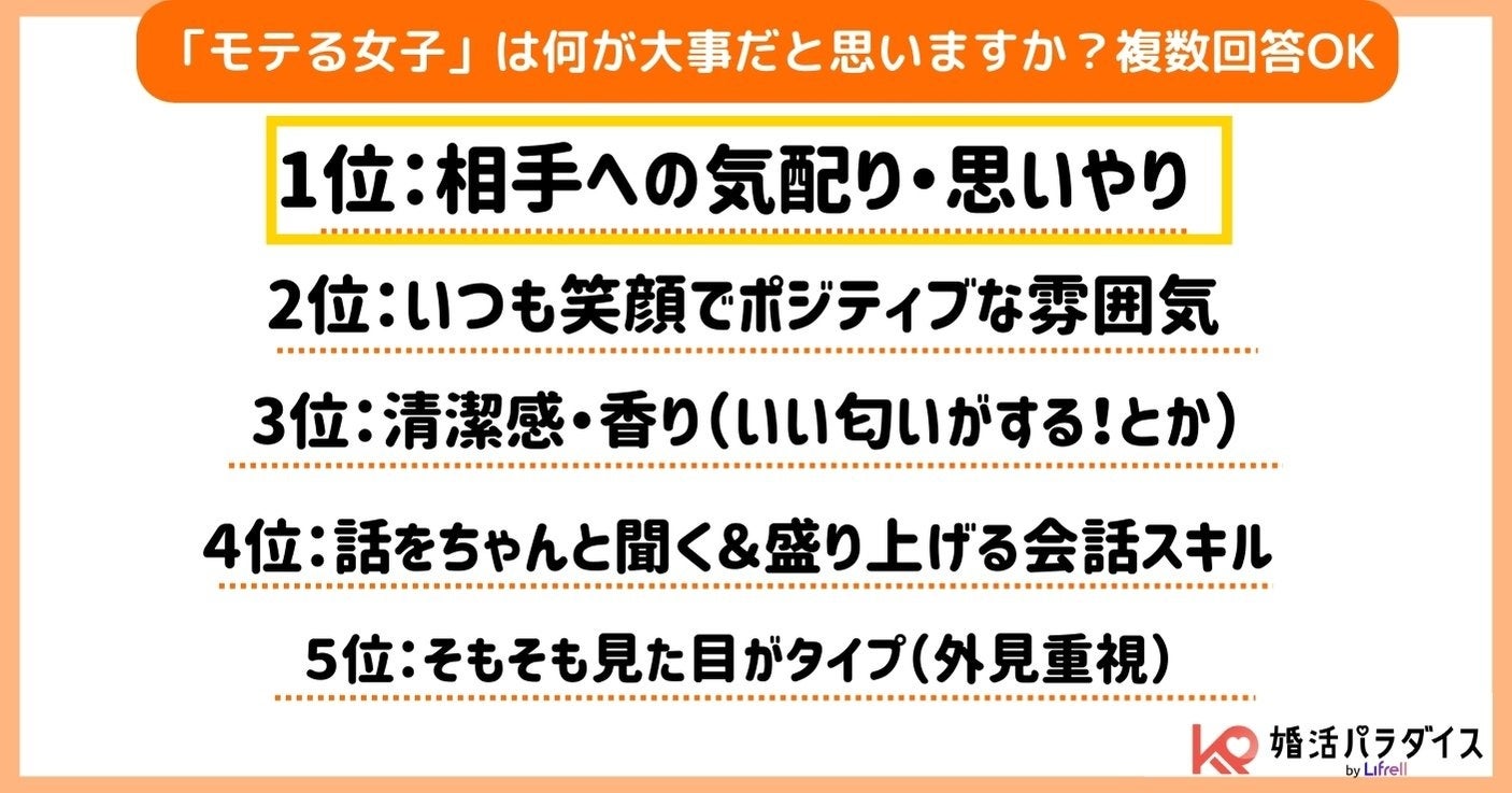 男性からは「相手への気配り・思いやり」「いつも笑顔でポジティブな雰囲気」が重要視されているという結果になりました。