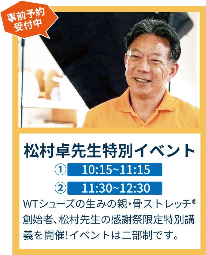 本イベントでは、WTシューズの試し履きやその場でのご購入はもちろん、会場限定で未発表の新作シューズを先行公開します。さらに、WTシューズの生みの親でもある、芯動骨整体®(骨ストレッチ®)創始者の「松村卓先生」をお迎えし、この日限りの特別講義も実施します。