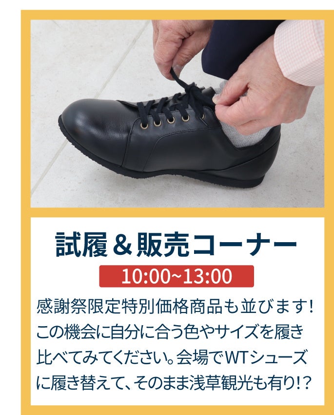 一度履いたら手放せない「立つ・歩く・座る」がラクになる魔法のシューズ『WTシューズ』を実際に体験し、特別講義も無料で観覧できるスペシャルなイベントです。