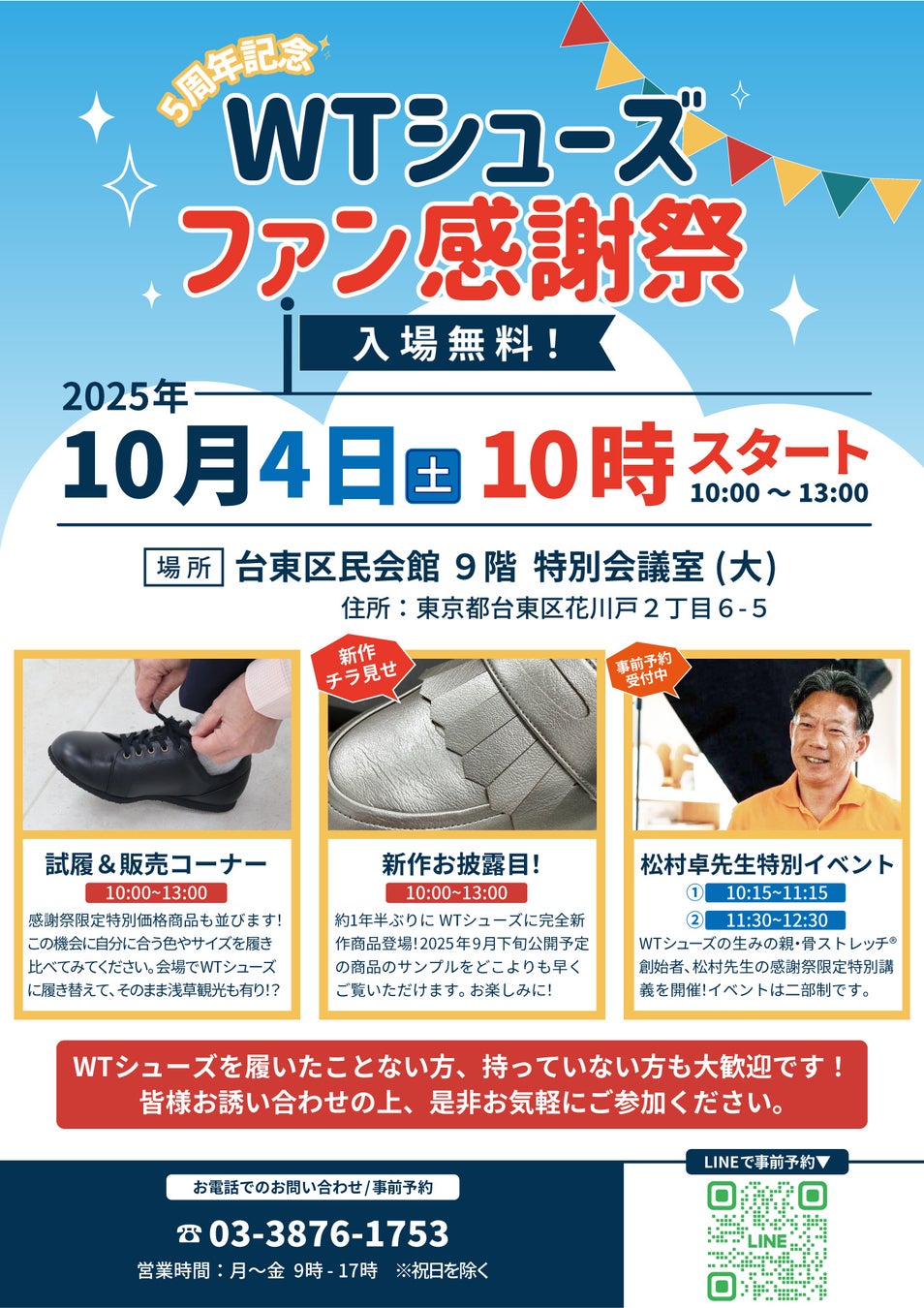 ミドルエイジ向けウォーキングシューズ『WTシューズ』(本社:東京都台東区 代表取締役:河原勢朗)は、ブランド誕生5周年を記念し、日頃のご愛顧への感謝を込めた「WTシューズファン感謝祭」を開催いたします。