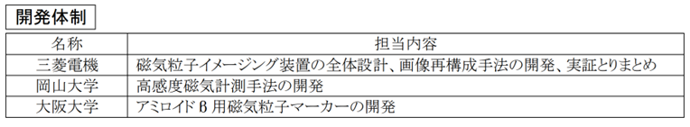 三菱電機株式会社(以下、三菱電機)、国立大学法人岡山大学(以下、岡山大学)、国立大学法人大阪大学大学院工学研究科(以下、大阪大学)は、国立研究開発法人日本医療研究開発機構(以下、AMED)の支援のもと、1kHz以下の低周波でもヒトの脳サイズの領域の磁気粒子を高感度に撮像でき、電源装置の大型化を抑えた「磁気粒子イメージング装置」を世界で初めて(※1)開発しました。この装置を用いて、アルツハイマー病の原因物質とされるアミロイドβ(※2)に結合する磁気粒子を撮像することで、アミロイドβの蓄積量とその分布を測定し、アルツハイマー病発症前の画像検査の実現を目指します。