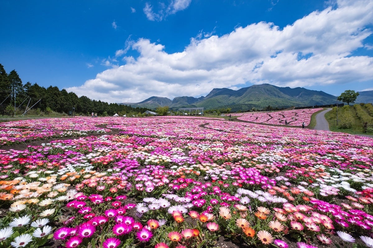 標高850mの久住高原の春は他の地域より遅いのが特徴ですが、冬の寒さを耐えた花たちは輝きを放ち、高原のキャンバスを埋め尽くします。遅めの春は、可憐なチューリップから始まり、視界に入りきらないほどのネモフィラの花畑、パッチワークのような植え込みが人気の「春彩の畑」、そして色鮮やかなリビングストンデイジーの目前に立つと、まるで異世界に立っているかのような気さえしてくるでしょう。