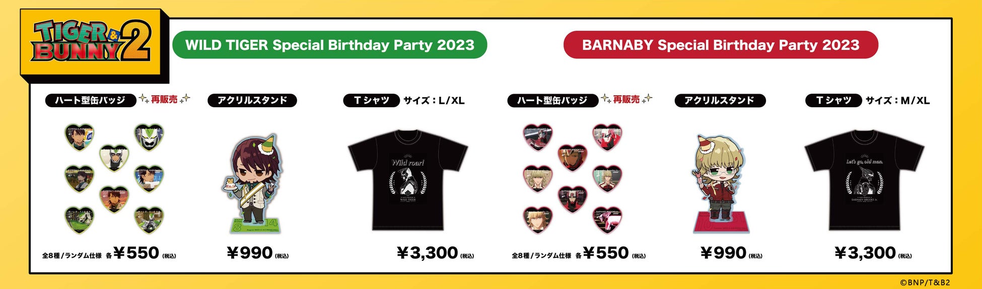 直近開催したイベント「WILD TIGER Special Birthday Party 2023」と「BARNABY Special Birthday Party 2023」にて販売された「アクリルスタンド」「Tシャツ」のほか、人気商品の「ハート型缶バッジ」も販売いたします。