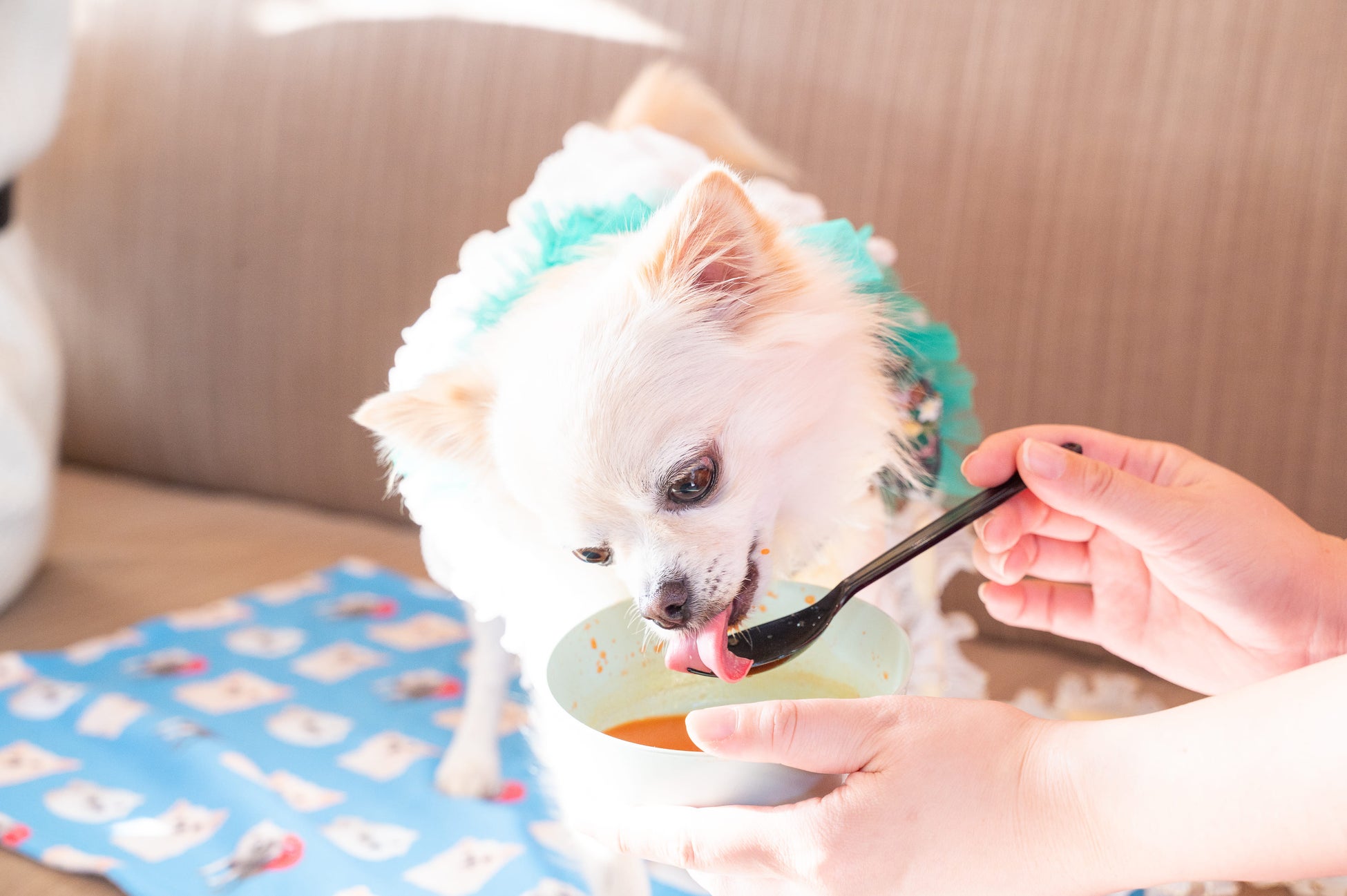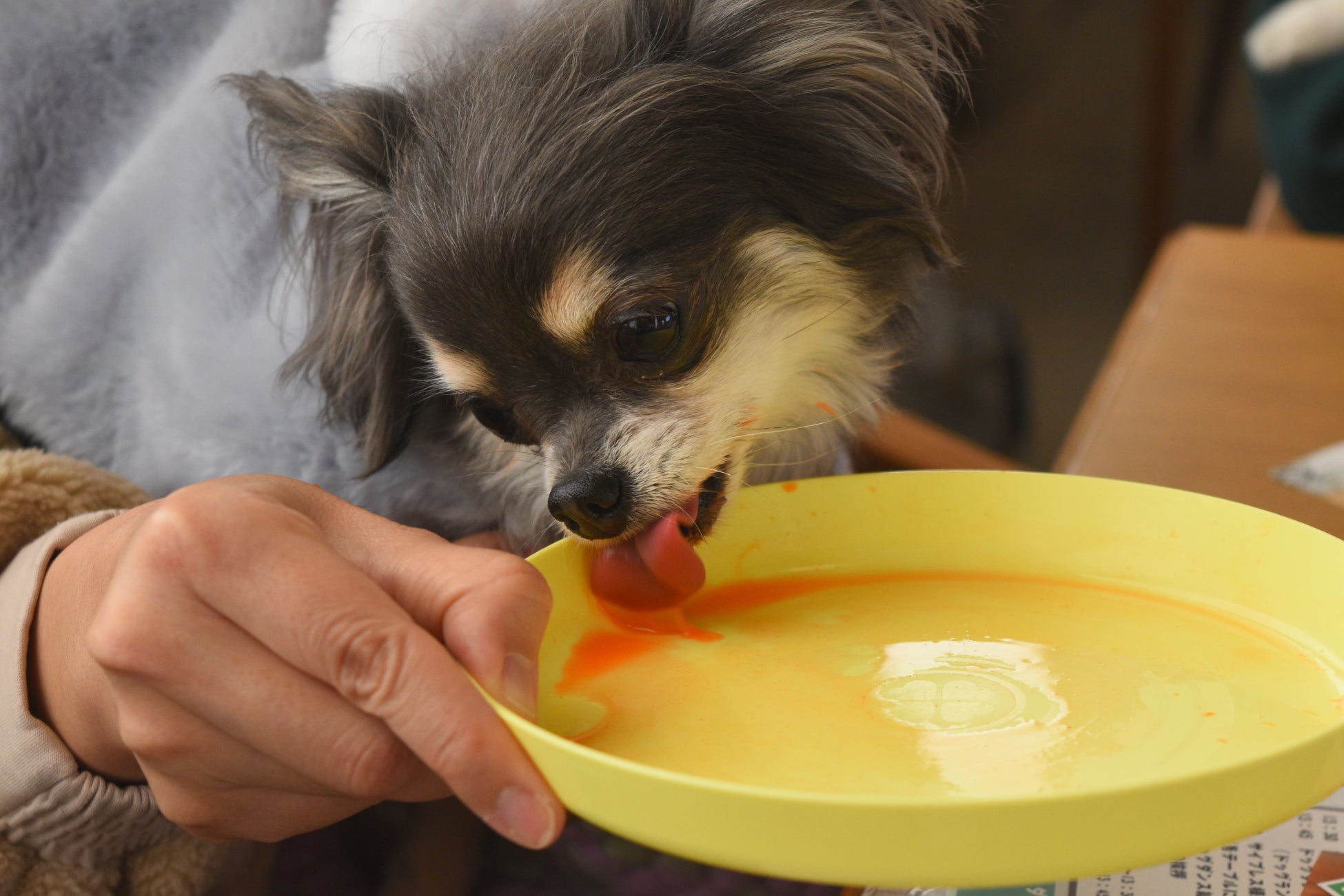 さらに、飼い主さんとわんちゃんが一緒に楽しめるニンジンジュースも提供され、乾杯の掛け声が上がると、飼い主さんの「甘ーい!」という驚きの声とともに、わんちゃんがゴクゴクとあっという間に飲み干してしまう様子も見られました。