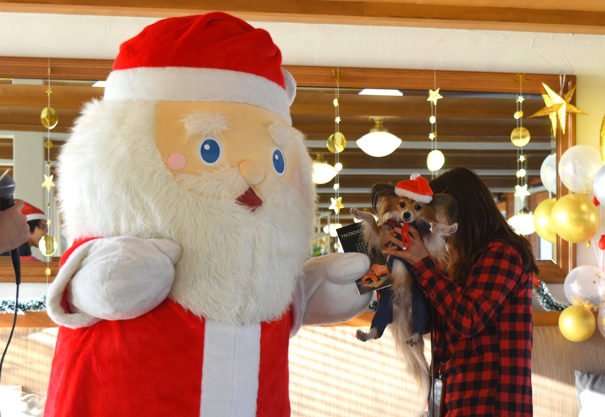 イベントの最後には、ペトナビサンタから、クリスマス限定のお土産がプレゼントされました!目の前に突然現れたサンタクロースに、はじめはびっくりするわんちゃん、猫ちゃんもいましたが、ミネラルフリーウォーターやフルーツゼリーなど、本イベントだけの特別なプレゼントに、嬉しそうな様子を見せてくれました。