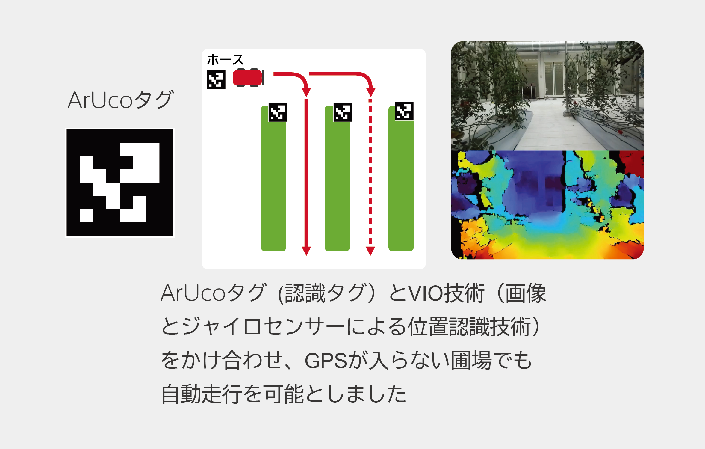 自動走行型スマート農薬噴霧機「スマートシャトル」は、二次元コードの一種であるArUcoタグ(認識タグ)とVIO技術(画像とジャイロセンサーによる位置認識技術)を掛け合わせにより、GPSの使えないビニールハウス内でも自己位置を推定し、自動走行でビニールハウス内の畝間や通路を移動することが可能です。