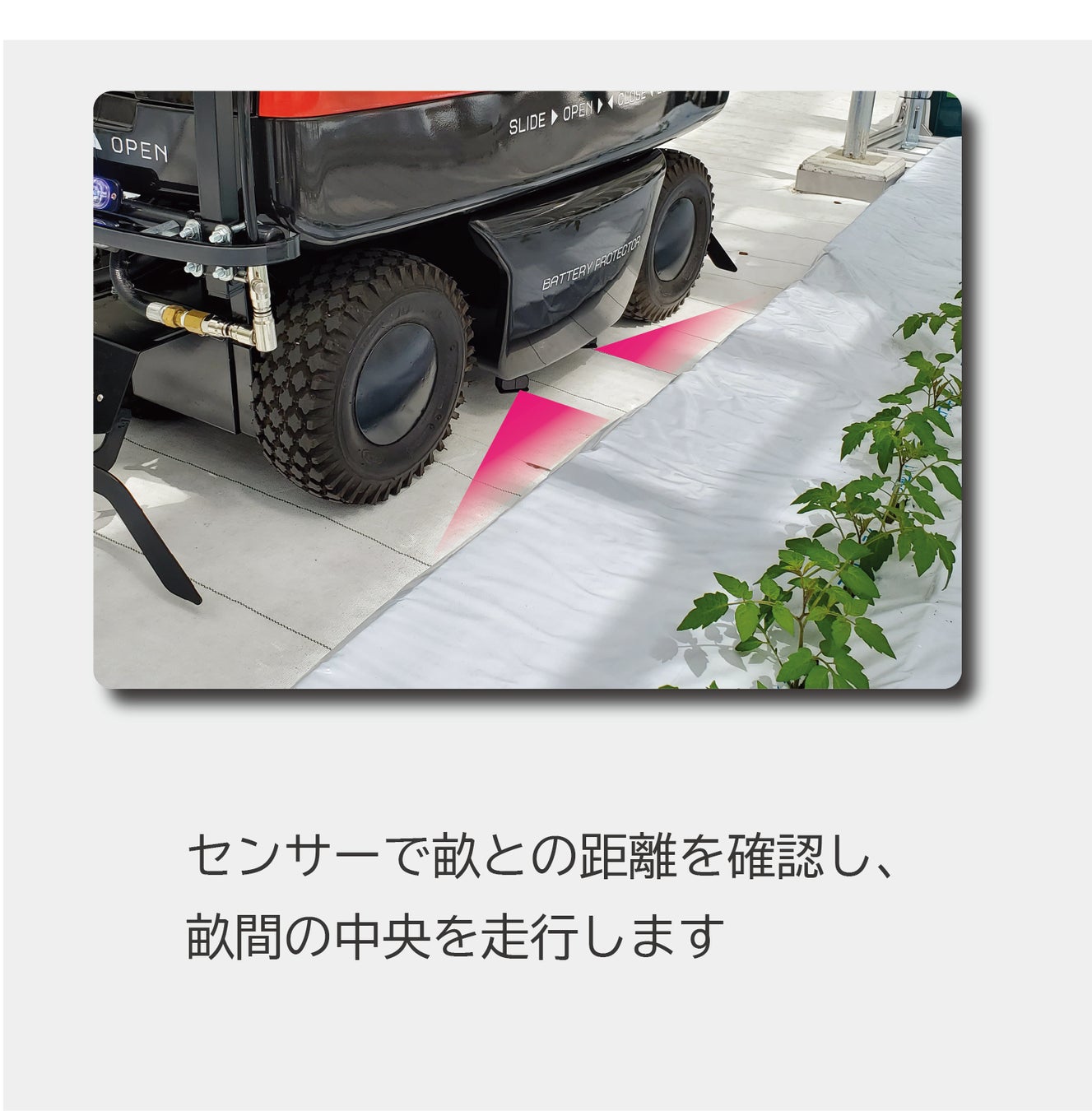 また、側面に距離センサーを設け、畝との距離を測定することで常に畝間中央を走行します。