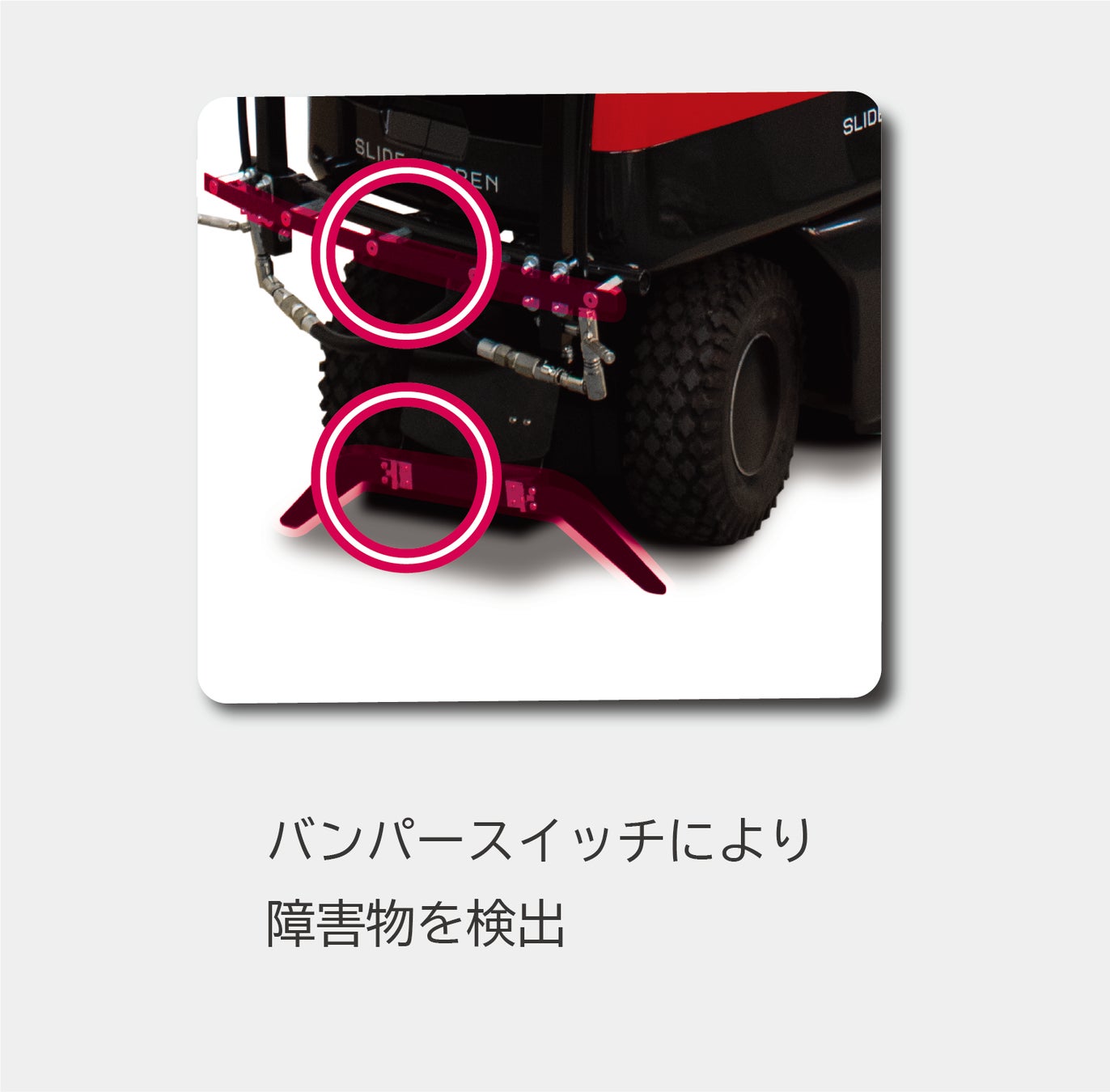 前後にあるバンパースイッチ(2種類)で障害物を検出し、緊急停車します。