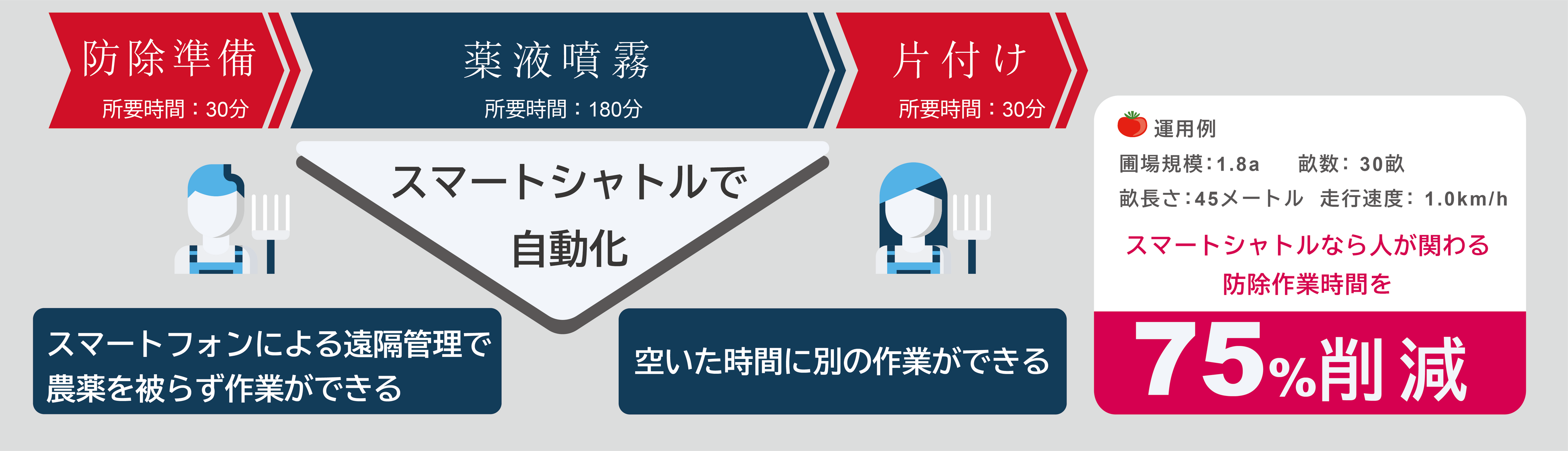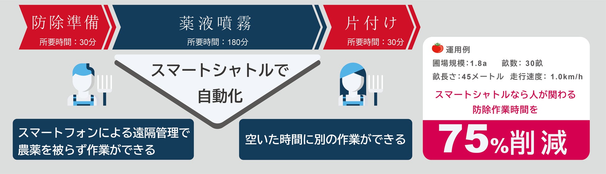 これにより、防除作業の省力化や大幅な作業時間短縮が実現でき、例えば防除準備から片付けまで240分かかっていた圃場の場合、スマートシャトルを導入することで作業にかかる時間を約75%削減することができます。