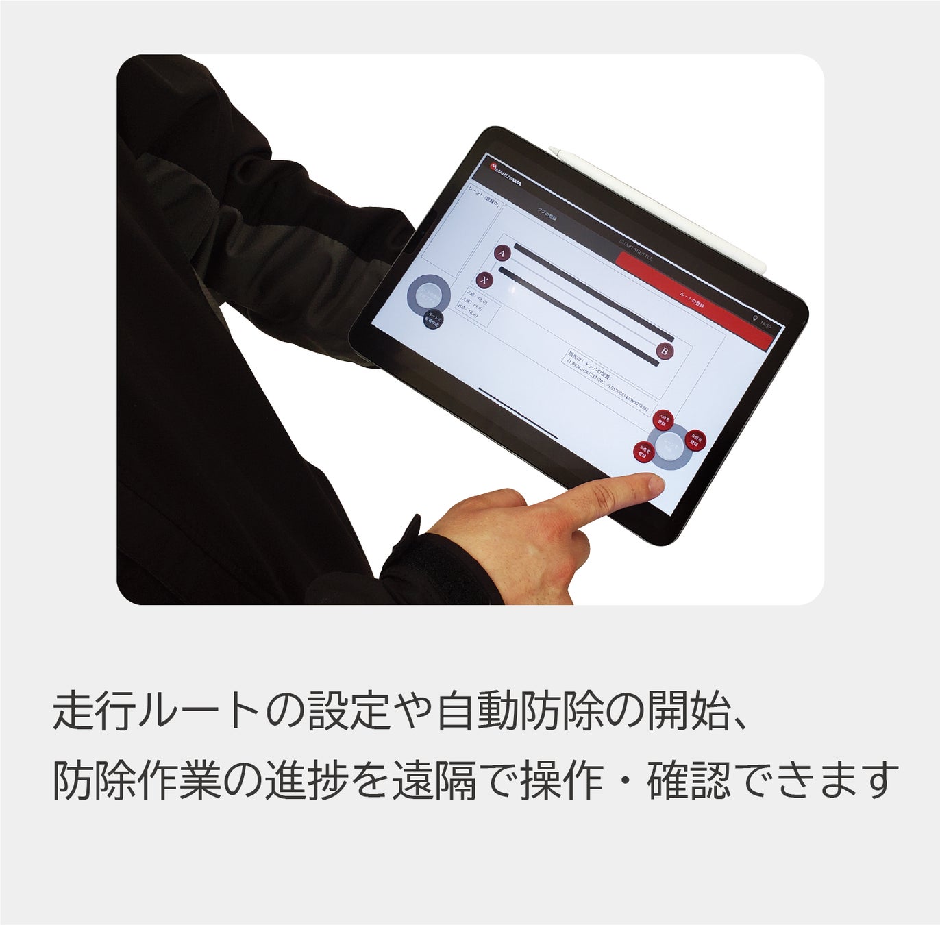 本体の操作はゲームパッドとタブレットやスマートフォン端末に入れたアプリから遠隔で行えます。走行ルートの設定や自動防除の開始、防除作業の進捗を遠隔で操作・確認できます。機体の状況をモニタリングでき、緊急停止等の異常を検知した場合もお知らせします。また、スマートシャトルとポンプをIoTで連携させ、ポンプのON/OFF操作を行うことも可能です。