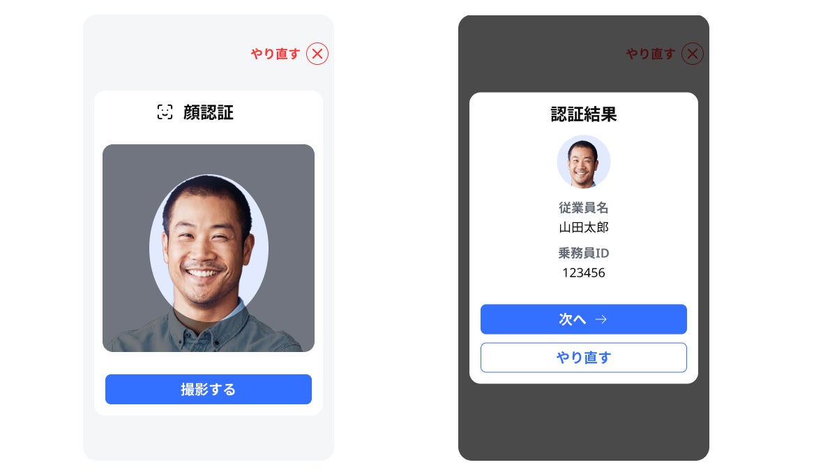 なりすまし防止のため、乗務員はスマホの顔認証サービスを通じて認証を行います。顔をスキャンすると「Lark自動点呼」は乗務員の基本情報を照会します。その後、乗務員の顔認証情報と運転免許の写真が同一人物かのチェックを行います。スマホで都度認証を行うので、不正が起きにくい仕組みとなっています。