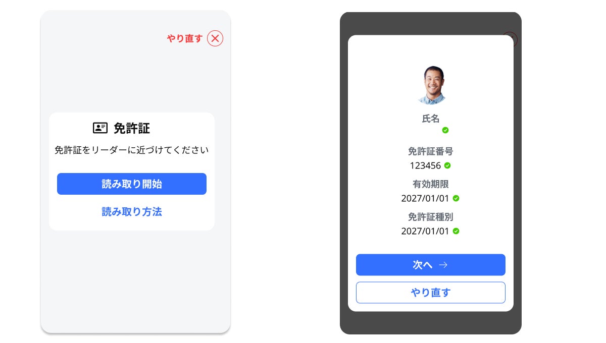 まずは運転手の免許証を確認します。Larkに免許証をかざすと、免許証を読み取って情報を確認します。期限が切れていれば、ここでアラートが出る仕組みです。