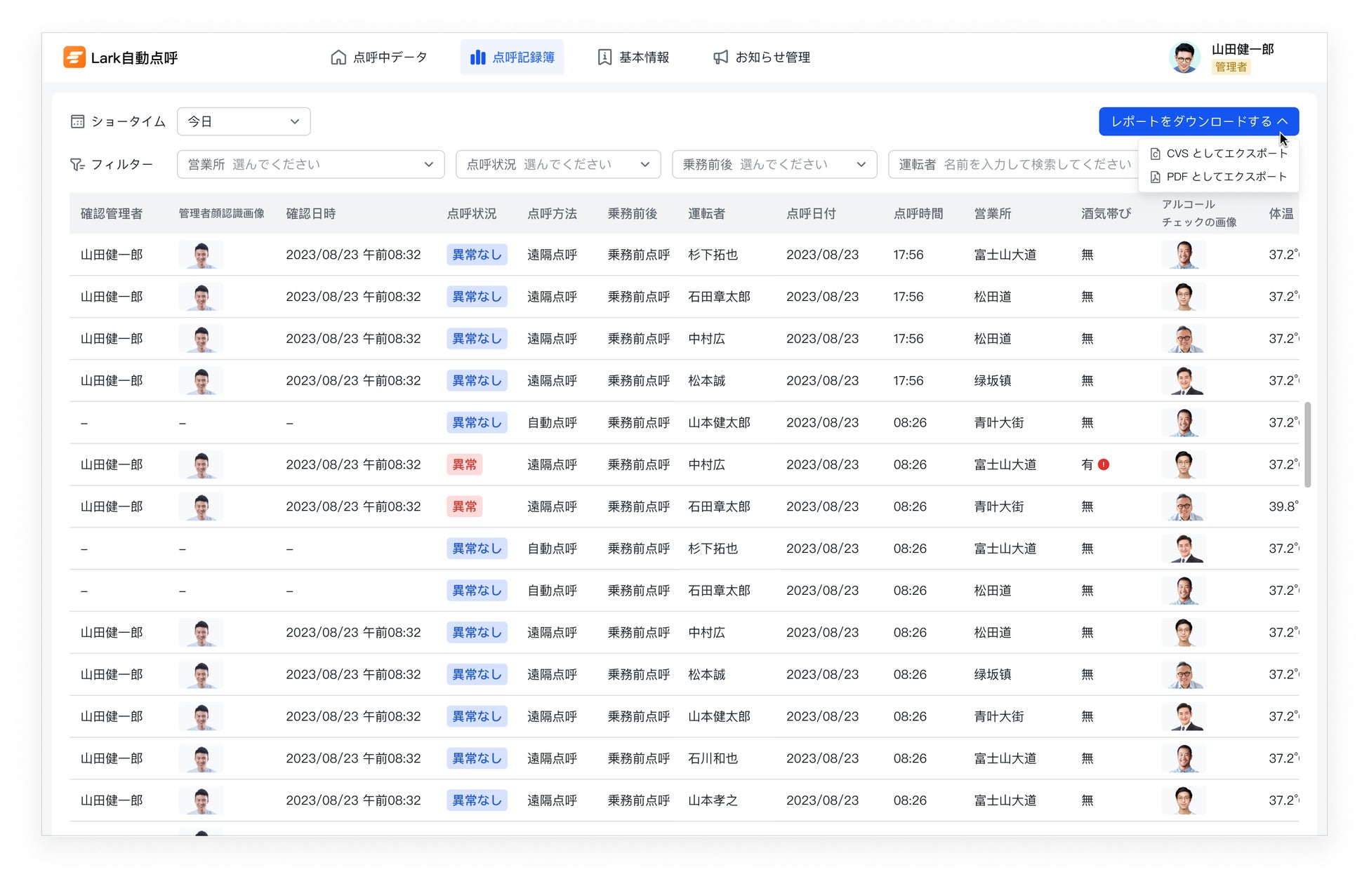「Lark自動点呼」なら日々の点呼業務をスマホ一つで行い、そのデータを一括管理することができます。そして遠隔点呼のデータは管理者側で共有可能で、日頃の点呼状況、過去のデータなども簡単に見ることができます。