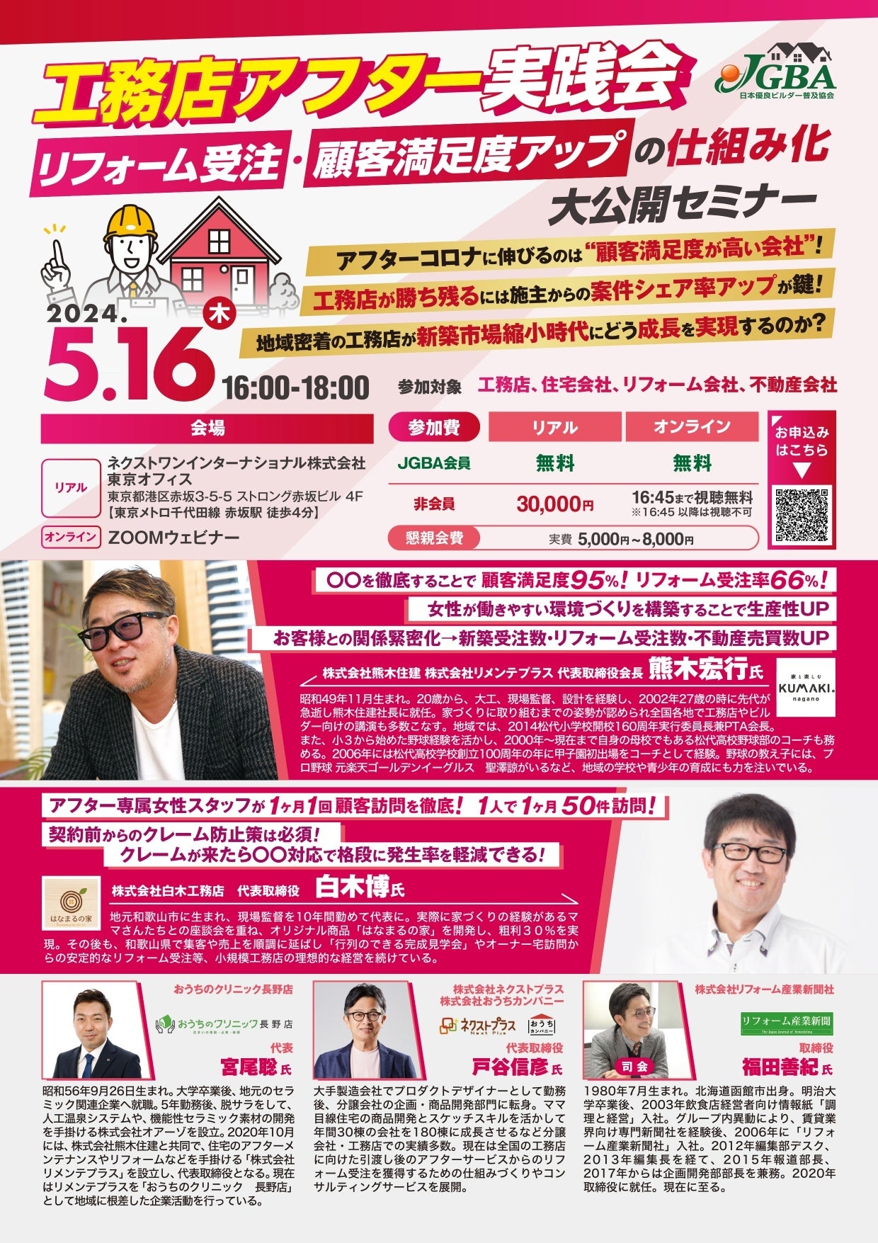 JGBA「工務店アフター実践会~リフォーム受注・顧客満足度アップの仕組み化 大公開セミナー~」開催決定