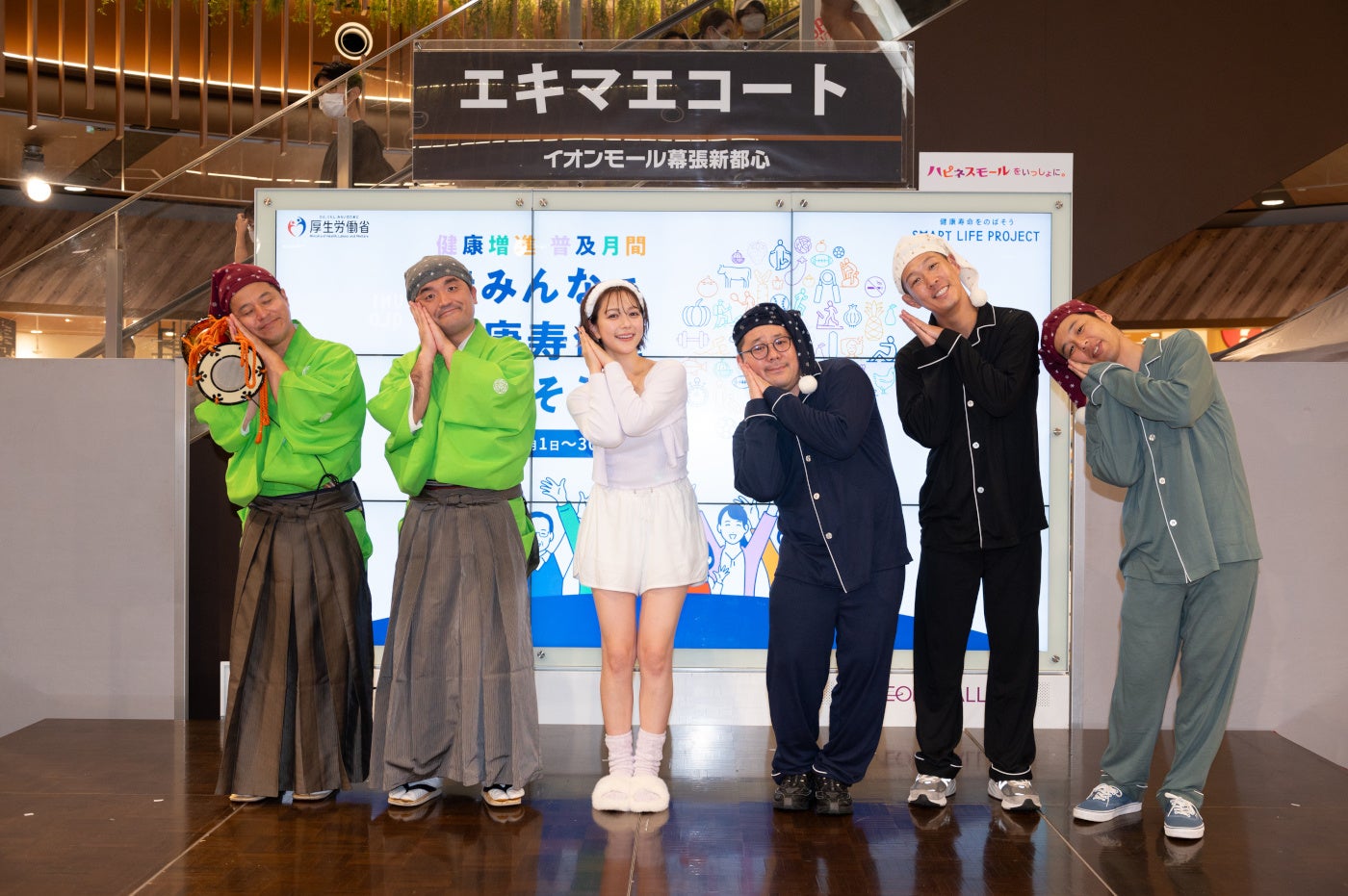 この取り組みのスタートに合わせたPRイベントを、9月8日(日)イオンモール幕張新都心 エキマエコートで開催しました。イベントには睡眠に関する専門家のほか、ゲストにタレントの村重杏奈さん、お笑い芸人のすゑひろがりずさん、ネルソンズさん、ナイトキャップを被ったピカチュウとカビゴンが登場し、トークセッションを通して会場を盛り上げていただきました。