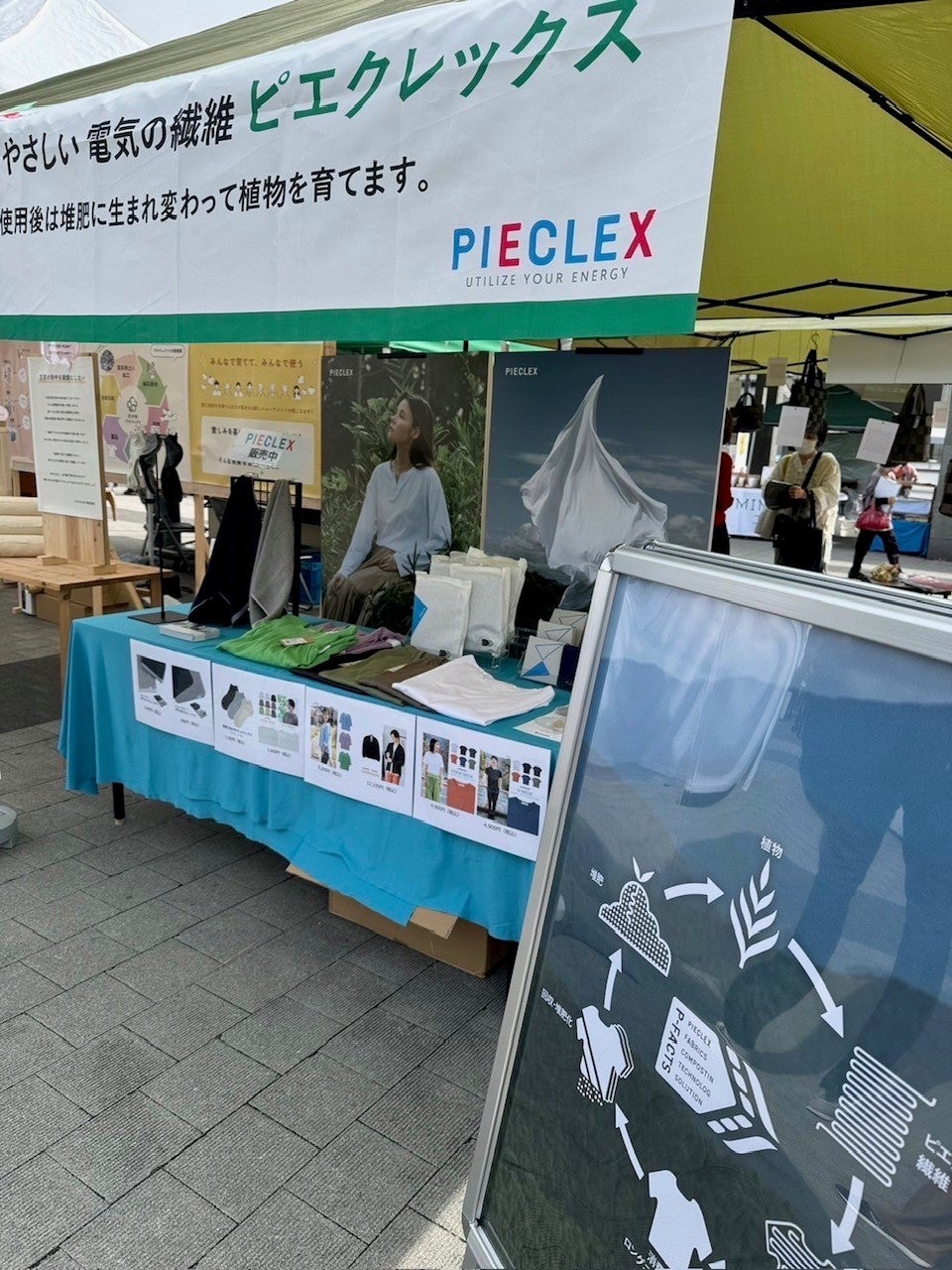 ピエクレックスのブースでは、当社が開発・製造・販売する、植物由来のポリ乳酸を原料とした素材である「電気の繊維」ピエクレックスを使用したTシャツやタオルなどのオリジナル製品の販売を行いました。また、当社が推進する循環インフラ「P-FACTS(ピーファクツ)」について、製品が分解し堆肥化していく過程の実際のサンプルをデモ展示し、ブースにお越しいただいた多くのお客様に当社の取り組みをご紹介しました。