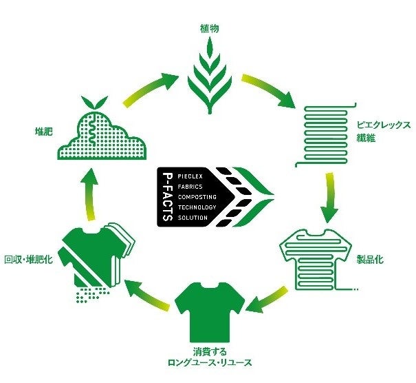 「P-FACTS」(PIECLEX FAbrics Composting Technology Solution)は、ピエクレックス社が主導し、植物由来のポリ乳酸を原料とした素材である「電気の繊維」ピエクレックスを使用したアパレル製品や繊維製品を回収し、林業や農業での利活用を目的とする堆肥化までを、パートナー企業、自治体、福祉施設、学校法人等、多くのステークホルダーと連携・共創し構築した、透明性高い循環インフラです。