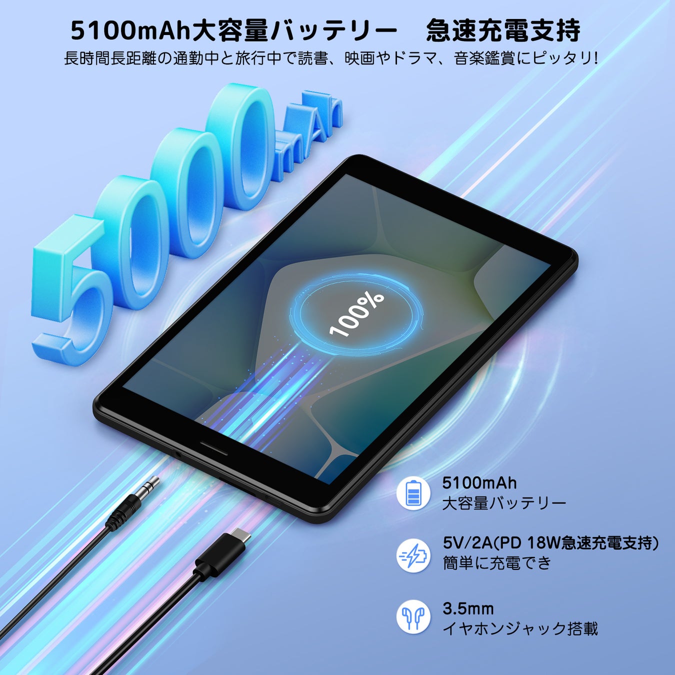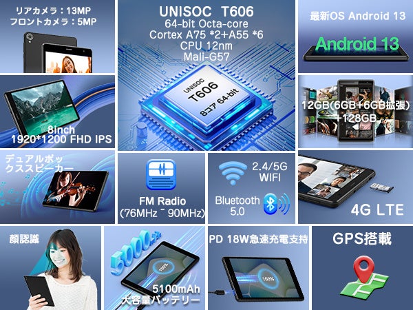Android 13 タブレット8インチ |1920* 1200 IPSディスプレイ|顔認証 |GPS 搭載|18W急速充電|Widevine L1対応 |プロセッサはUNISOC T606 |RAM:12GB(6GB+6GB拡張) |ROM:128GBで|実機でのAnTuTuベンチマークスコアは27万以上です。