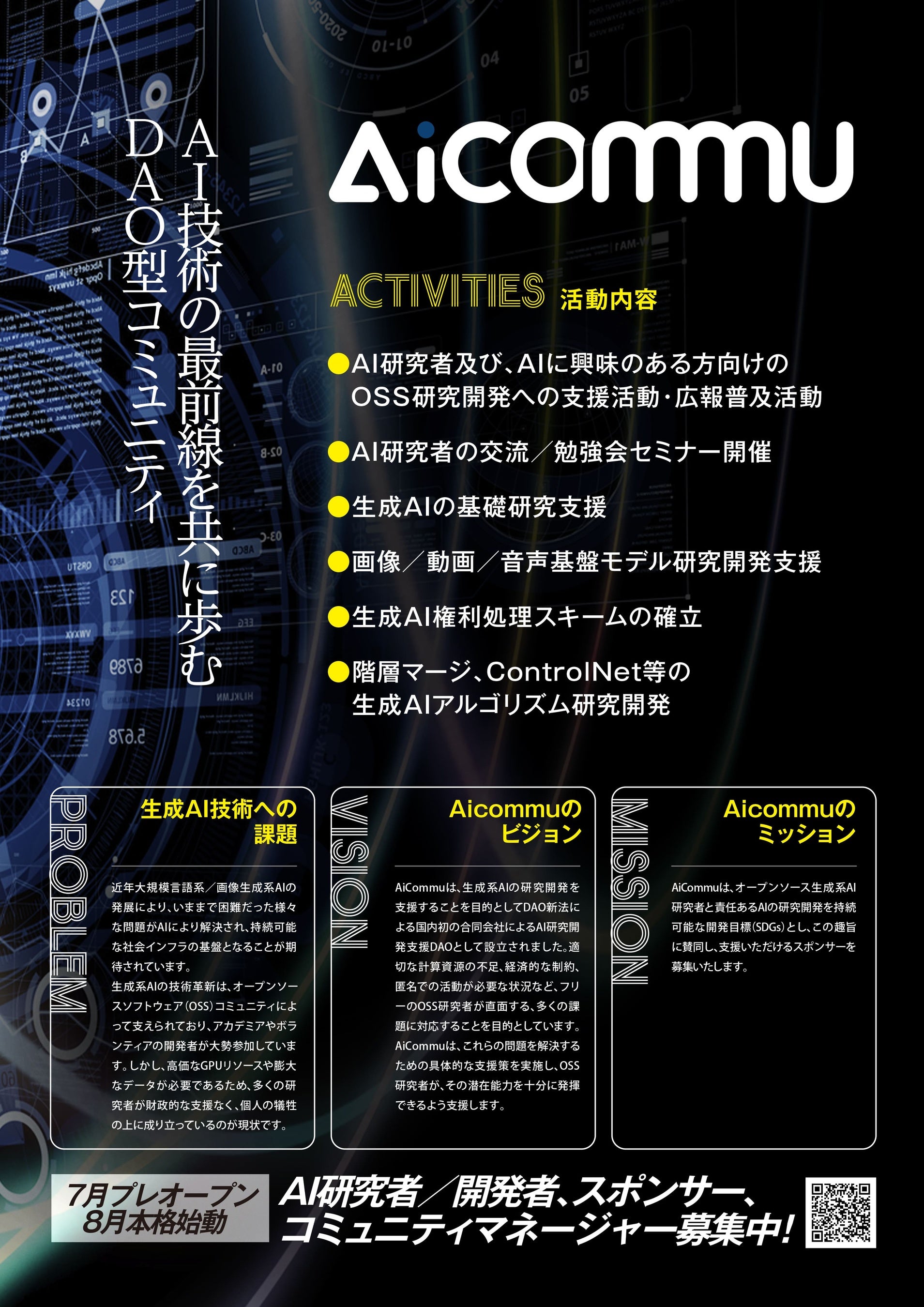 民主的で持続可能な生成系AIの開発に向け、オープンソースを始めとした生成系AI開発者の支援活動を行って参ります。8月の本格活動開始に向け、主旨にご賛同頂けるAI研究者/開発者、スポンサー、コミュニティマネージャーを募集を開始いたします。