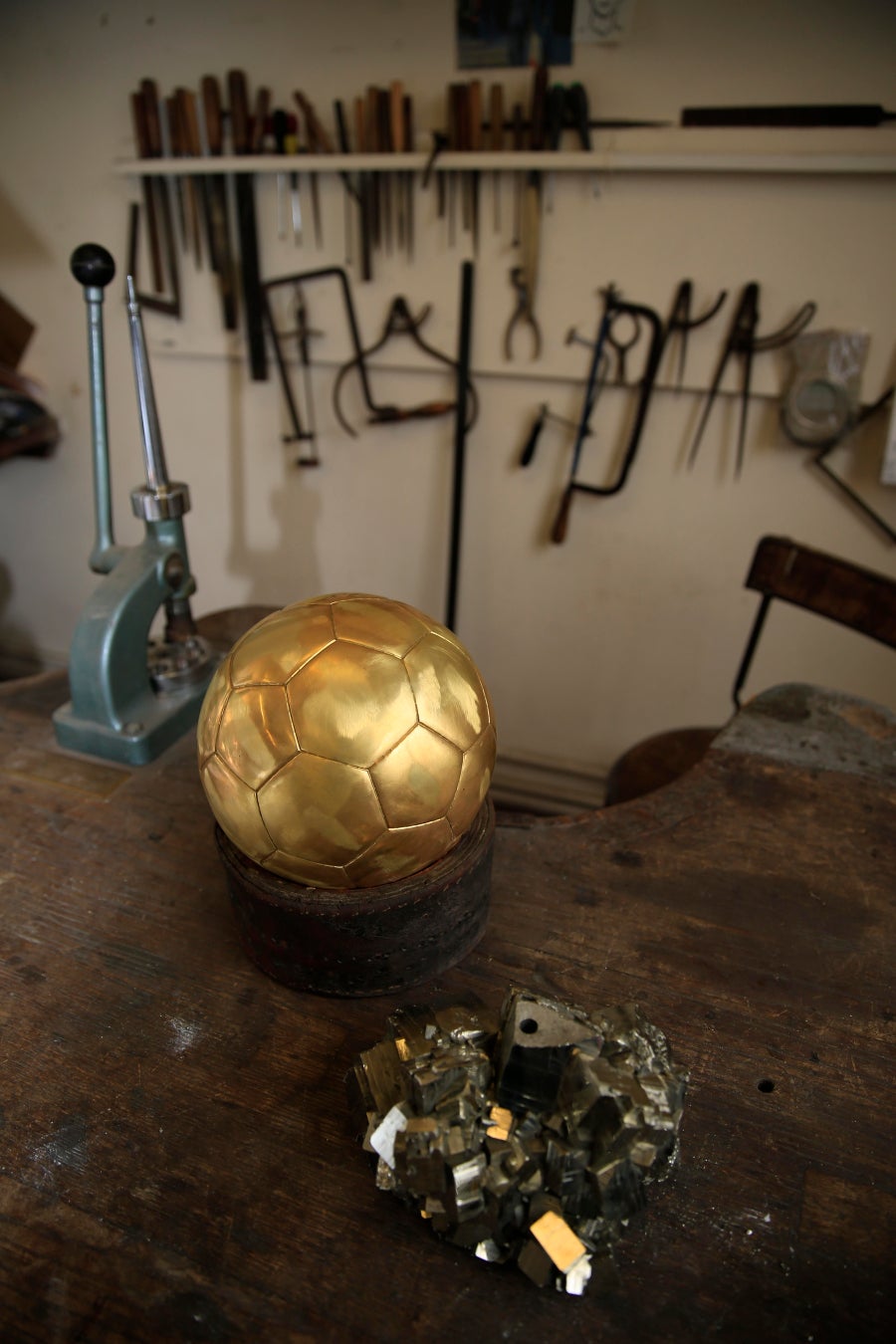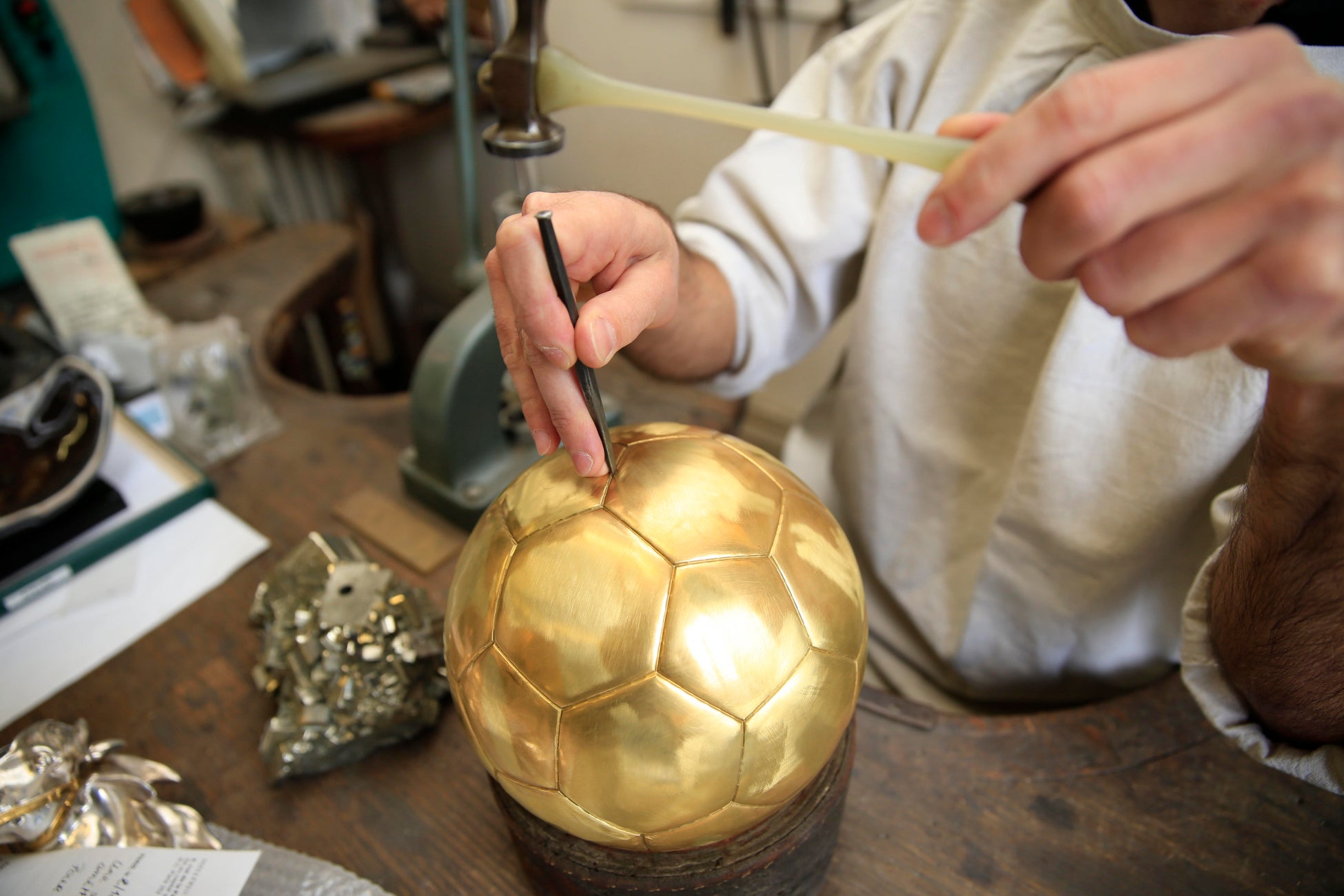 バロンドールトロフィーの制作には、6か月の工程が組まれ、100時間以上の職人技が注ぎ込まれます。まず、金細工師が真鍮の半球を2つ組み合わせ、サッカーボールの形を精密に再現。その後、メレリオの宝石の専門家が厳選したパイライト(黄鉄鉱)に宝石彫刻家が加工を施し、トロフィーの本体をしっかりと支える台座として仕上げます。パイライトは毎年異なる形状が選ばれるため、完成したトロフィーは唯一無二の仕上がりとなります。