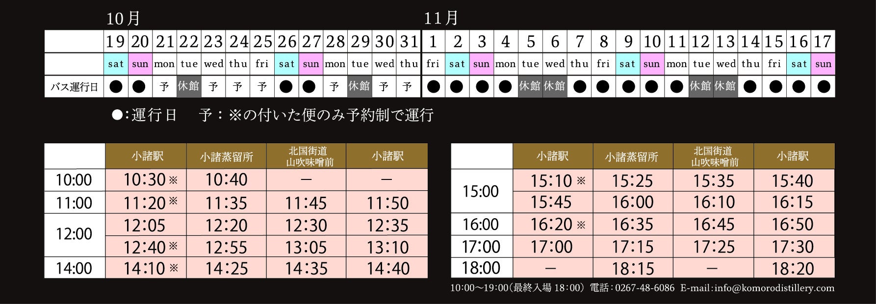特別企画期間中の10月19日(土)~11月17日(日)には、日本100名城の小諸城址懐古園で紅葉まつりが開催されます。期間中は、懐古園の紅葉ライトアップや演奏会、駅周辺における灯篭イルミネーションなど市内各所で様々なイベントが催されます。更に以下の日程では、小諸駅、北国街道、小諸蒸留所を結ぶ無料周遊バスを運行いたしますので、小諸市内を散策し、秋の信州を満喫する一日を過ごしてみてはいかがでしょうか。