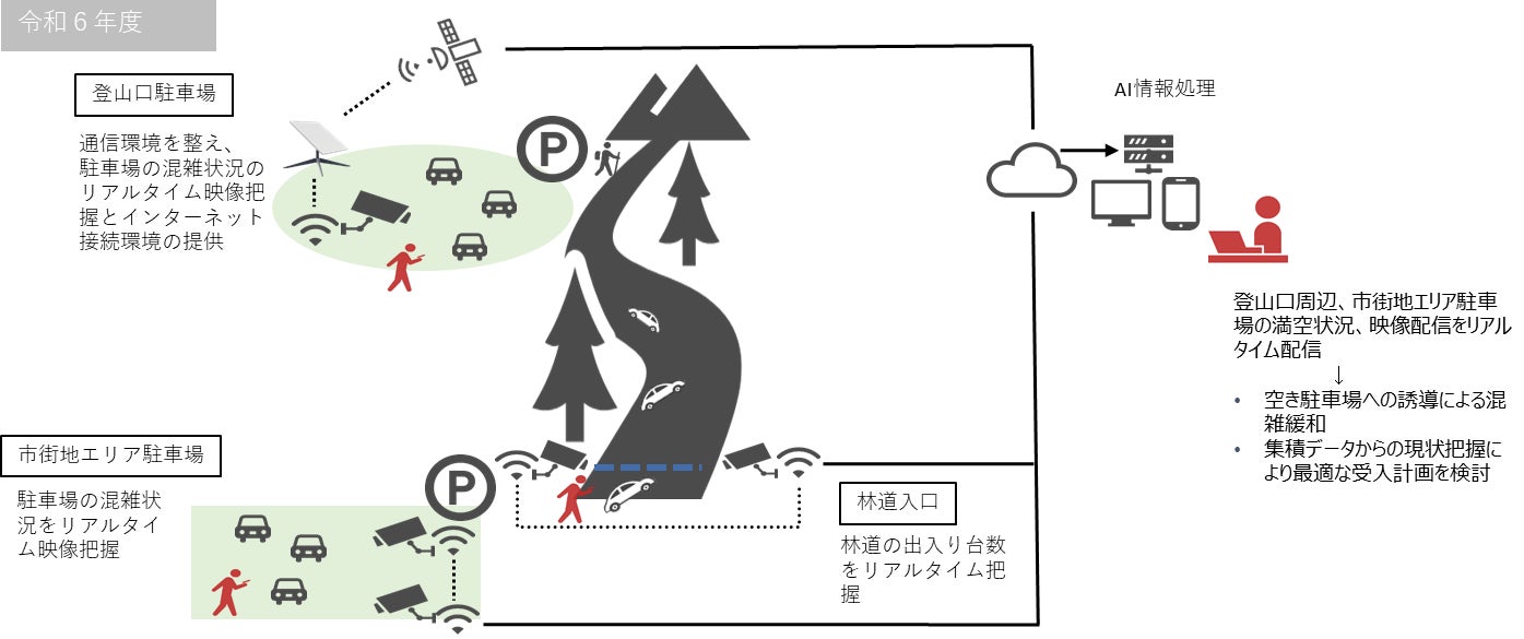 そこで、令和5年度に国立大学法人信州大学の知見も活用しながら、産官学連携で山間部での通信環境構築に向けた実証実験を実施。そしてこのたび登山者駐車場等混雑状況可視化システムの構築を行いました。