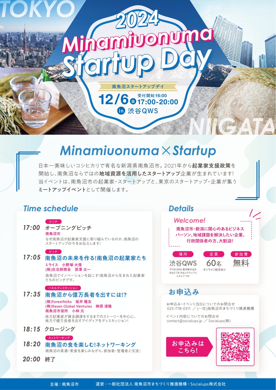 2024年12月6日(金)、Socialups株式会社(本社:新潟県新潟市中央区、代表取締役社長:髙瀬 章充)は、渋谷スクランブルスクエア(渋谷駅直結)15階「渋谷QWS」にて南魚沼市主催の『Minamiuonuma Startup Day 2024』を運営します。昨年に引き続き、南魚沼市の魅力や起業家支援の取り組みをPRするこのイベントでは、首都圏のビジネスリーダーやスタートアップ関係者を対象に、新たなビジネスチャンスや交流の場を提供します。南魚沼・新潟に関心、ゆかりのある皆様のご参加をお待ちしております。