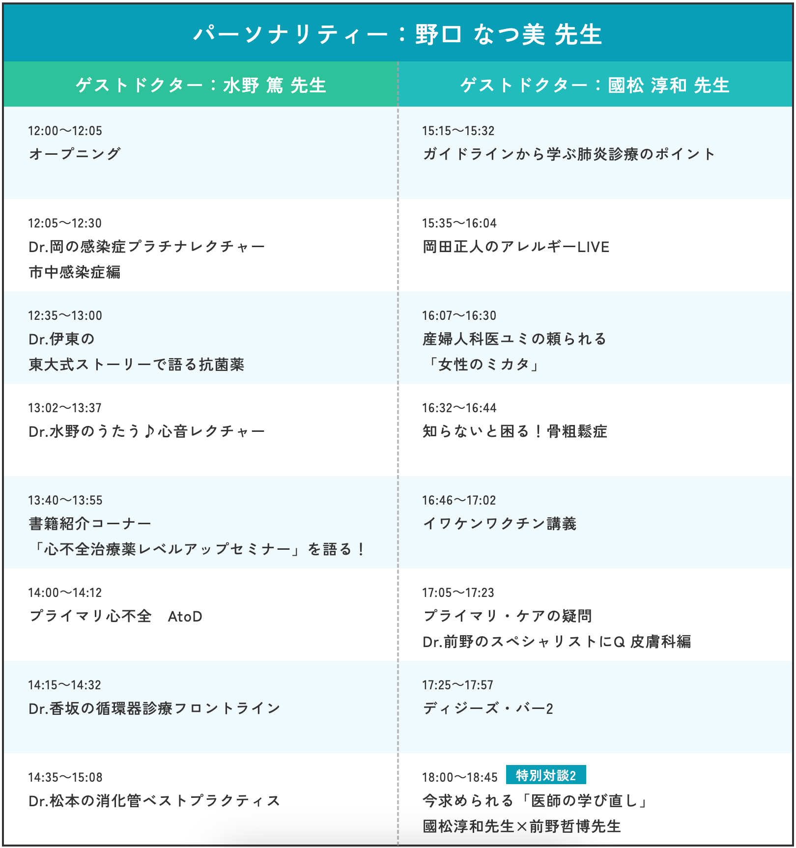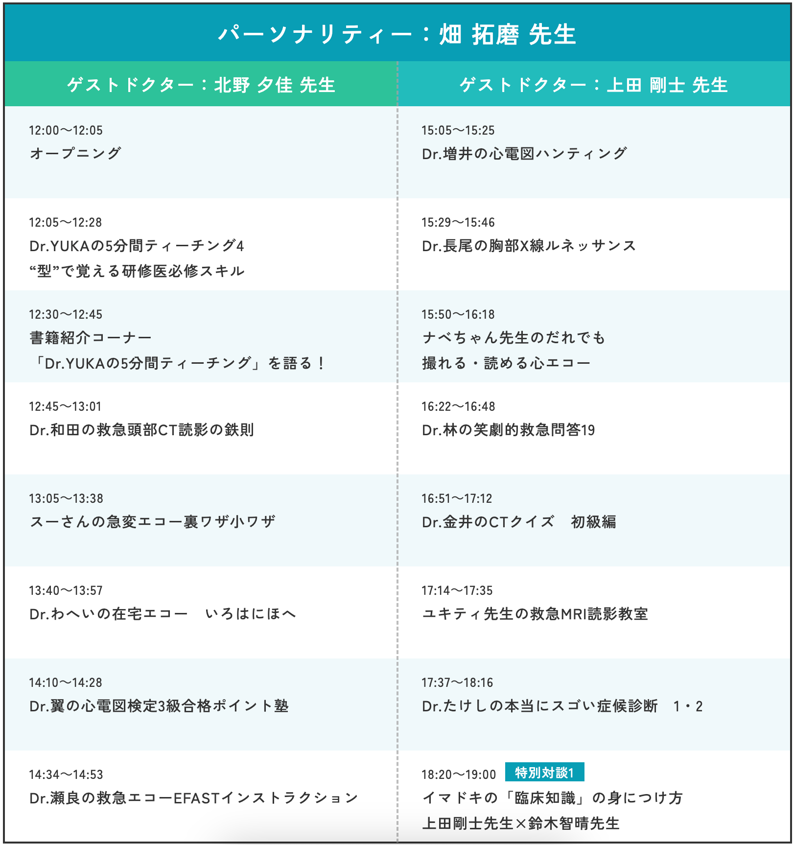2日間のLIVE配信では、CareNeTVで高い評価を得た番組を特別編成で放送します。スタジオにはDAY1には救急医療分野をリードする北野夕佳先生、上田剛士先生、DAY2には明快で歯切れの良い解説が人気の水野篤先生と國松淳和先生をゲストに招き、番組の見どころや裏話、臨床現場のリアルなどの生トークをお届けします。登録不要・完全無料で視聴いただけます。
