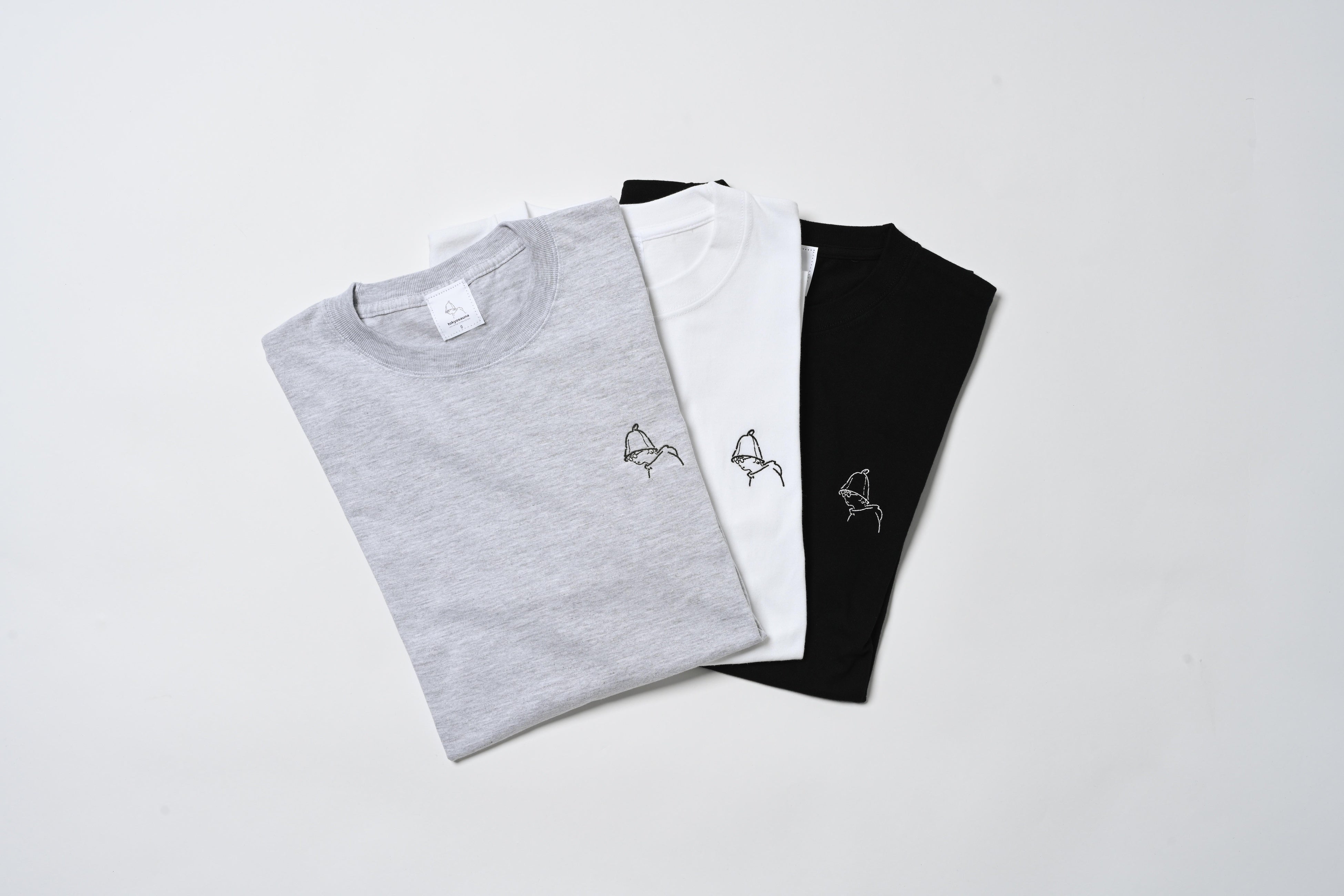tokyosaunaキャラクターが刺繍されたシンプルなデザイン。ふんわりと柔らかくサウナ後の素肌に合い、生地に厚みがあるので1枚でも着用していただけます。