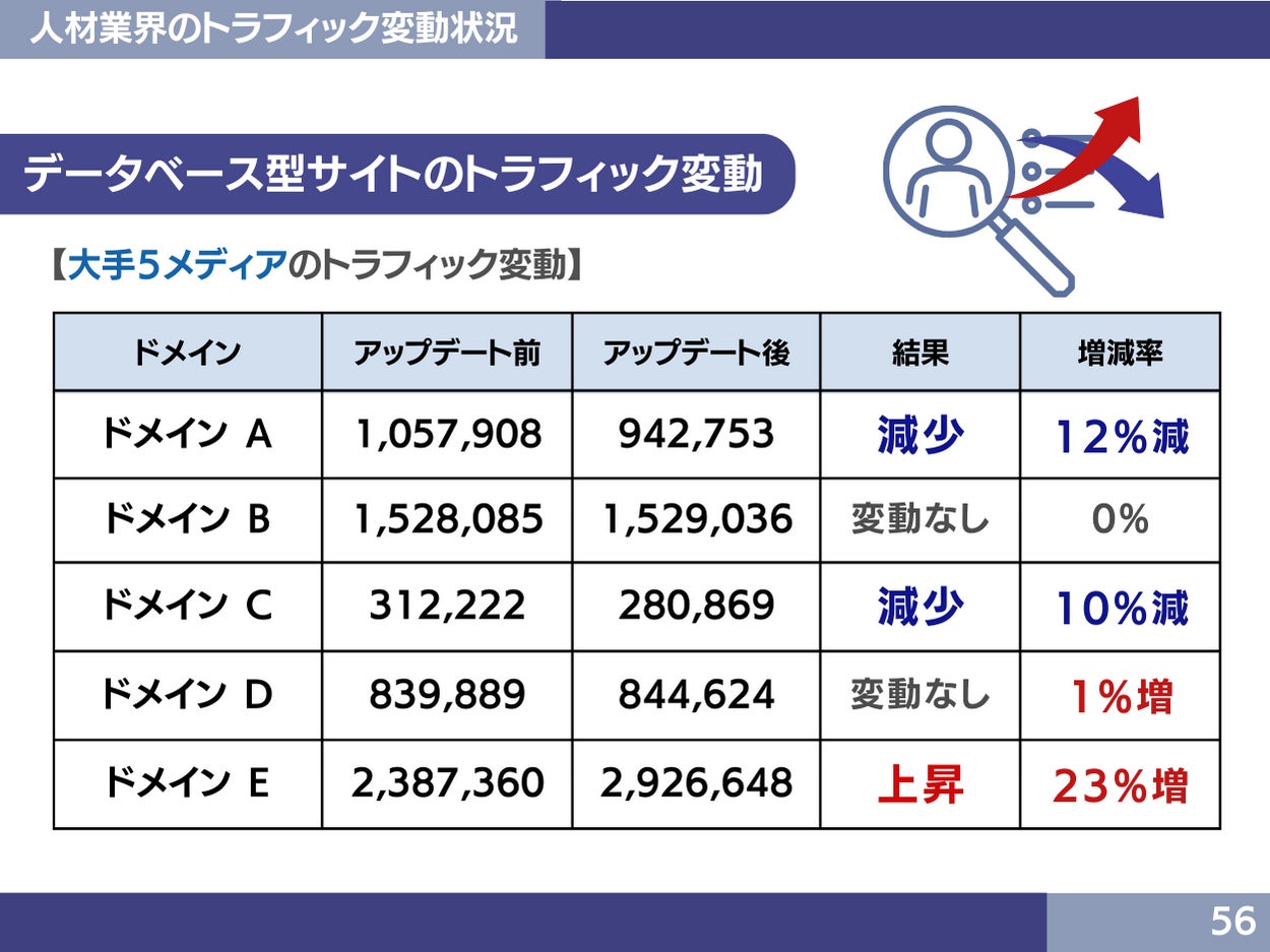 大手5大メディアのうち、口コミサイトのドメインEはトラフィック23%増、と観測したサイトの中で上がり幅の大きいサイトとなりました。他の求人サイトにはない独自の口コミによるユーザー体験の向上が、今回のGoogleのアップデートに良い影響をもたらしている可能性があります。