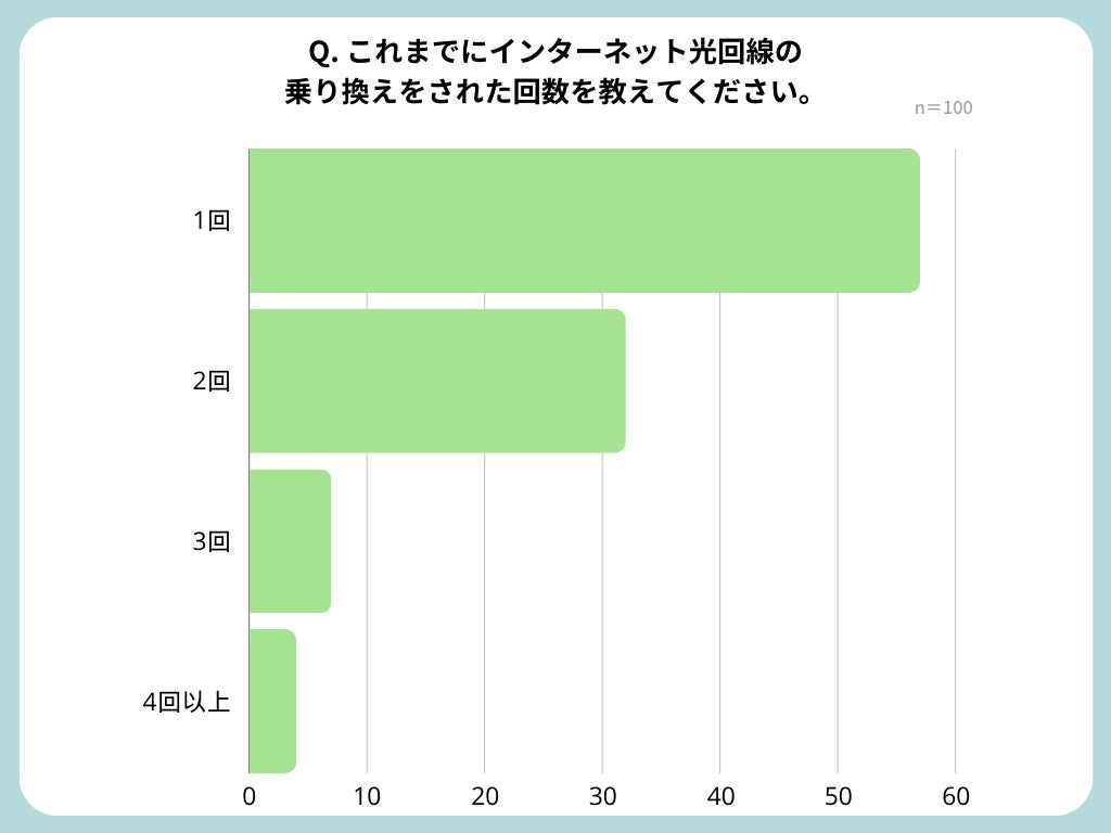 これまでに光回線の乗り換えをした回数は1回のみと答えた方が過半数を占め、100人中57名でした。