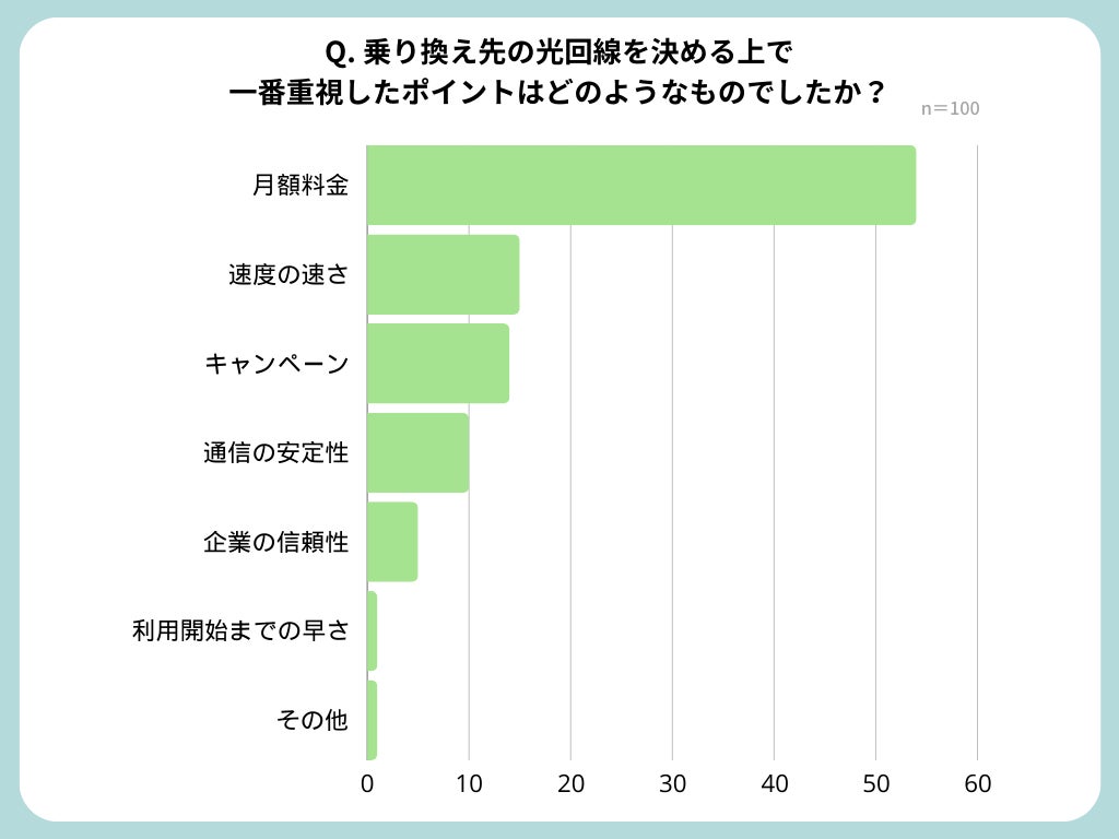 乗り換え先の光回線を決める上で一番重視したポイントについては、月額料金と回答した方が100人中54名と最多でした。