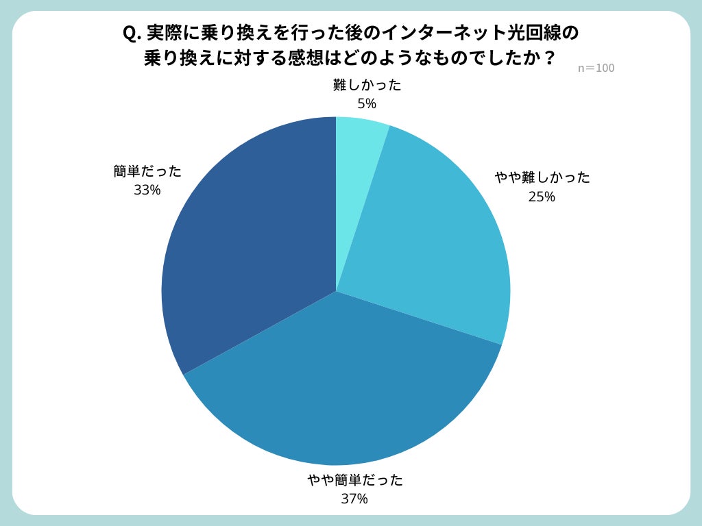 実際に乗り換えを行った後の光回線の乗り換えに対する感想については、簡単だった、やや簡単だったと回答した方が、合計して全体の70%を占めました。