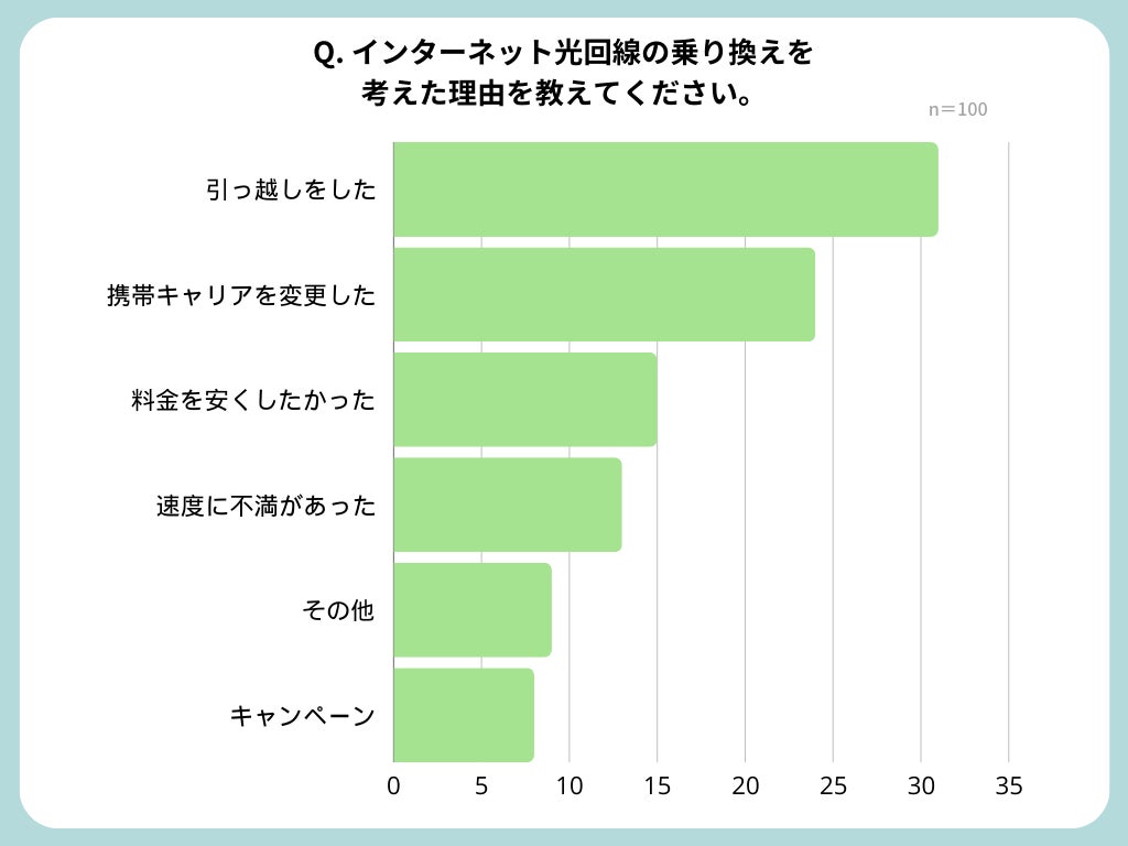 光回線の乗り換えを考えた理由では、引っ越しをしたと回答した方が最も多く、100人中31名でした。