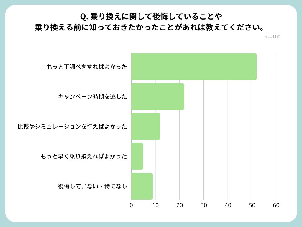 乗り換えに関して後悔していることや乗り換える前に知っておきたかったことでは、もっと下調べをすればよかったと回答した方が100人中52名と一番多く、