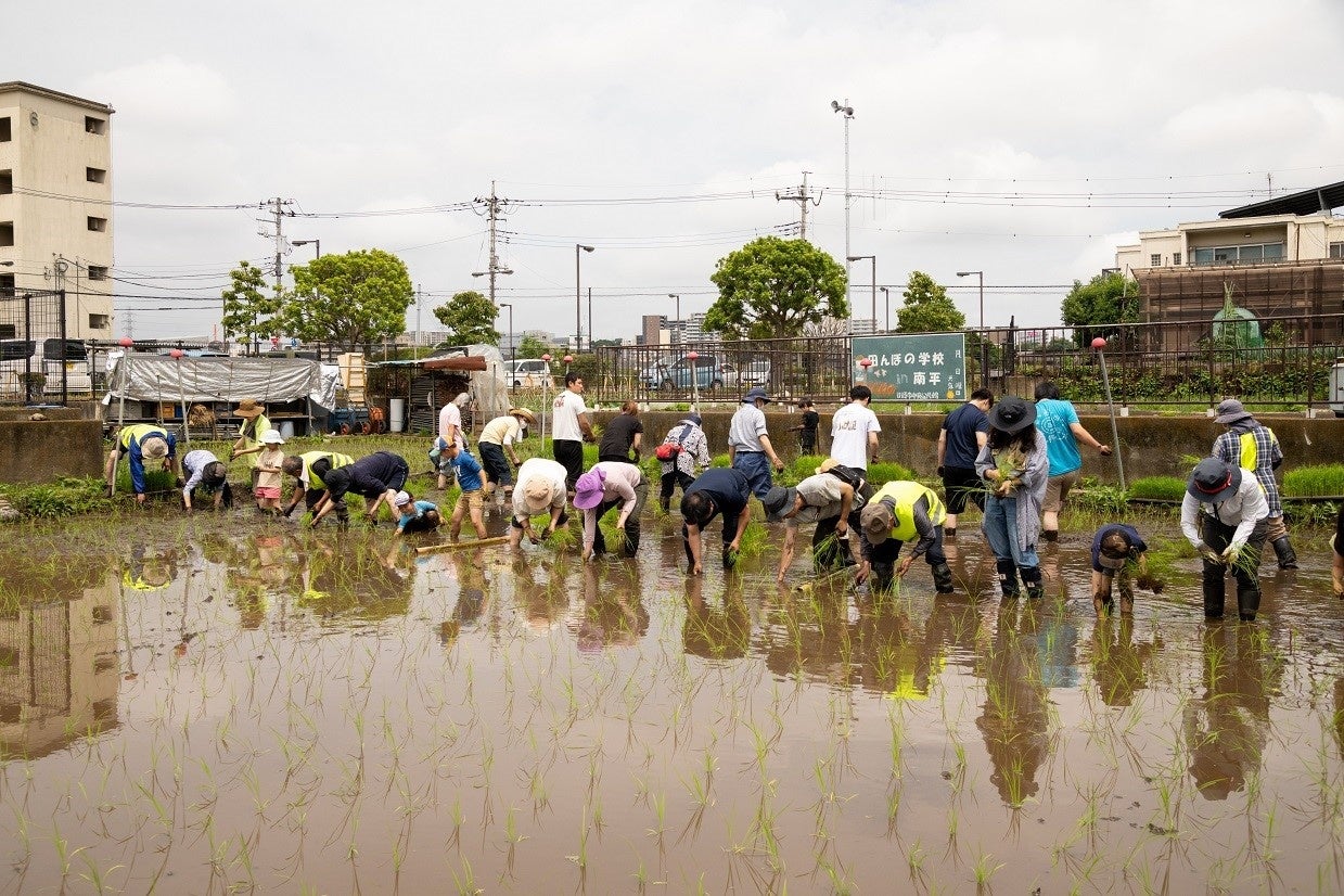 中央公民館では伝統的な農法で1年間の稲作体験を通じて、フードマイレージや環境問題、また、自然との共生を学ぶとともに、農業に対する興味や理解を深めてもらうことを目的に、市内2カ所の田んぼで「田んぼの学校」を実施しています。参加者は稲の種である籾を土にまく籾まきから参加し、田植え、案山子づくりを経て稲刈り・脱穀を行い、12月には1年間の成果として収穫祭を行います。