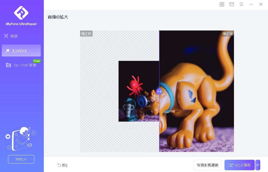 更新されたiMyFone UltraRepairが画像の拡大機能が搭載します。独自の技術で画像の二重ロスレス拡大までも完璧に完成できます。このツールは動作の安定性や高画質な処理をサポートします。JPEG、PNGなどほぼすべてのフォーマットに対応します。