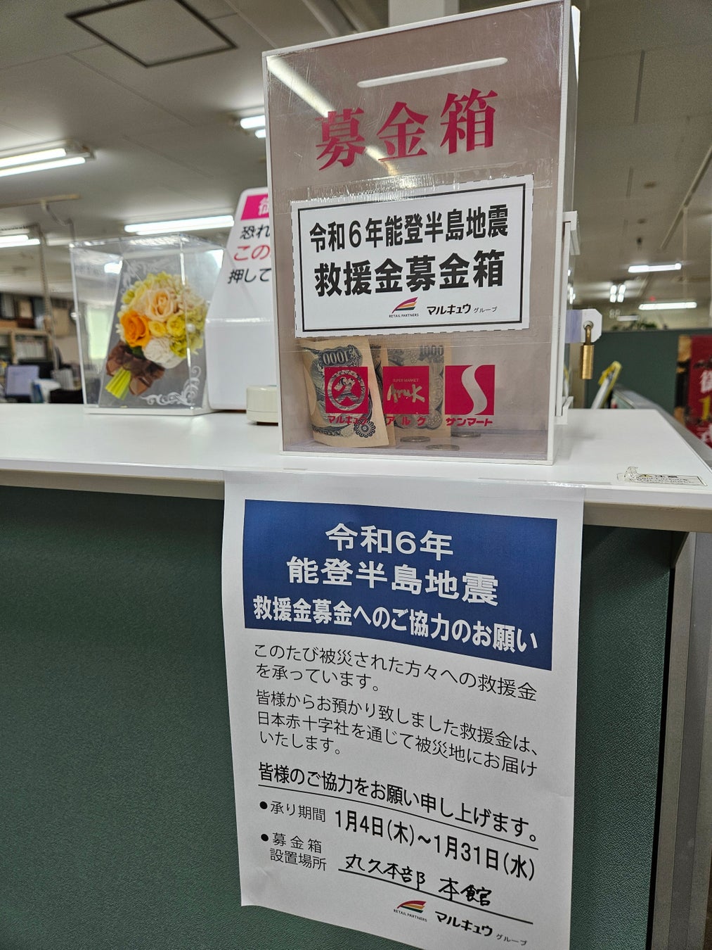 丸久グループではこの度の地震で被災された地域の皆様の復興に役立てていただくため、1月4日(木)から各店舗と各事業所にて救援金の募金を実施いたします。