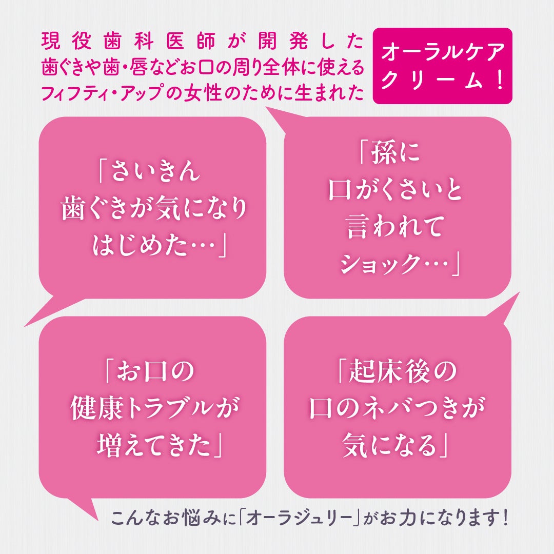 オーラルケアは歯の健康だけでなく、美しさや自信にもつながります。特に唾液や歯ぐきコラーゲンの加齢による減少は、口内環境を悪化させる原因。〈オーラジュリー〉は、加齢による変化に対応し、50代以上の女性の健康と美しさを口元からサポートする新しいオーラルケアの形を提案します。歯科医の知見と成分研究を活かした本商品の発表によって、フィフティアップの女性がより魅力的な社会を実現してまいります。