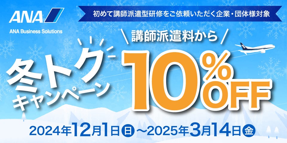 ANAビジネスソリューション株式会社(本社:東京都大田区/代表取締役社長:小林 弘典)は、初めて講師派遣型研修をご依頼いただく企業・団体様を対象に、キャンペーン対象プログラムの講師派遣料を10%割引いたします。